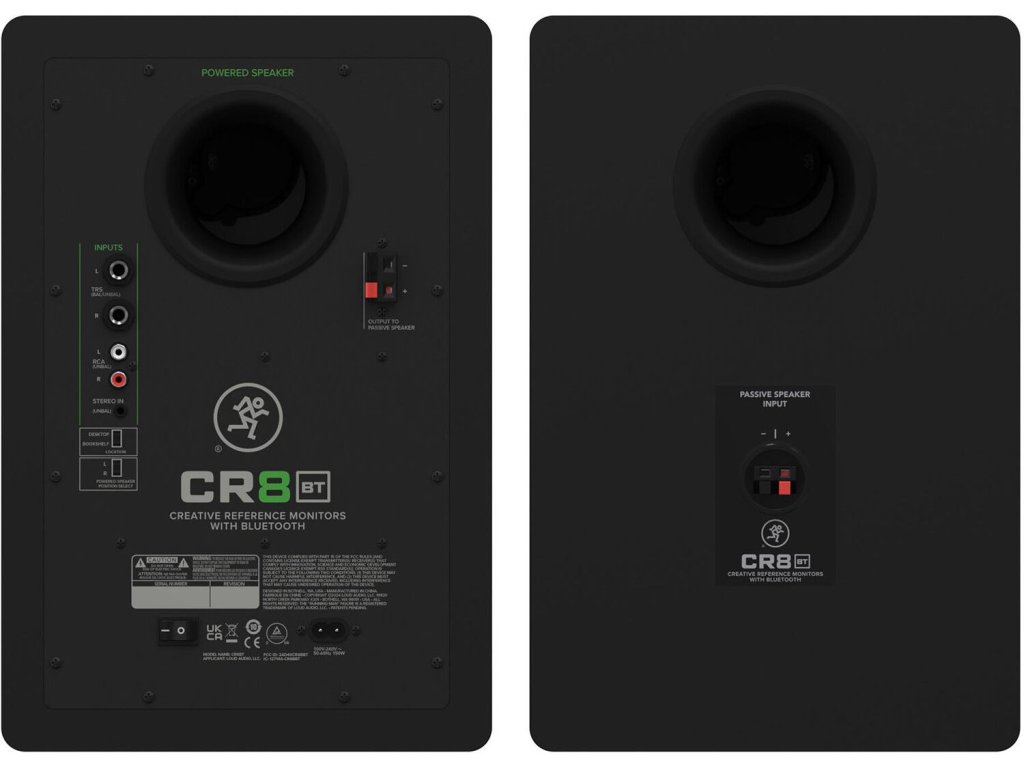 Mackie CR8BT są zawsze sprzedawane w parach, gdzie jeden z monitorów służy jako master, zawiera elementy sterujące i wzmacniacz, a drugi podłączasz kablem głośnikowym, który jest częścią zestawu. Monitory posiadają symetryczne wejścia TRS, niesymetryczne RCA, a także wejście stereo do szybkiego podłączenia telefonu lub notebooka. Dodatkowo ten model posiada wbudowany odbiornik Bluetooth do bezprzewodowego przesyłania muzyki bezpośrednio ze smartfona lub tabletu.