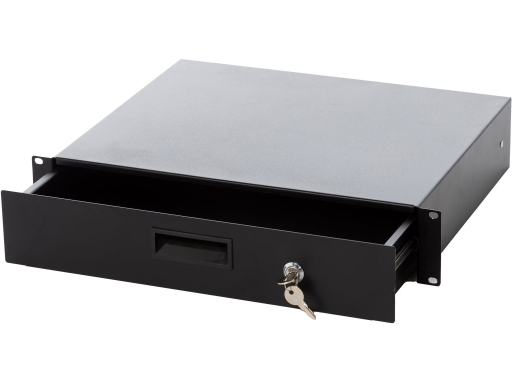 Zamykana żelazna półka z dwiema przegródkami. Pasuje do szafy rack 19" 2U.
