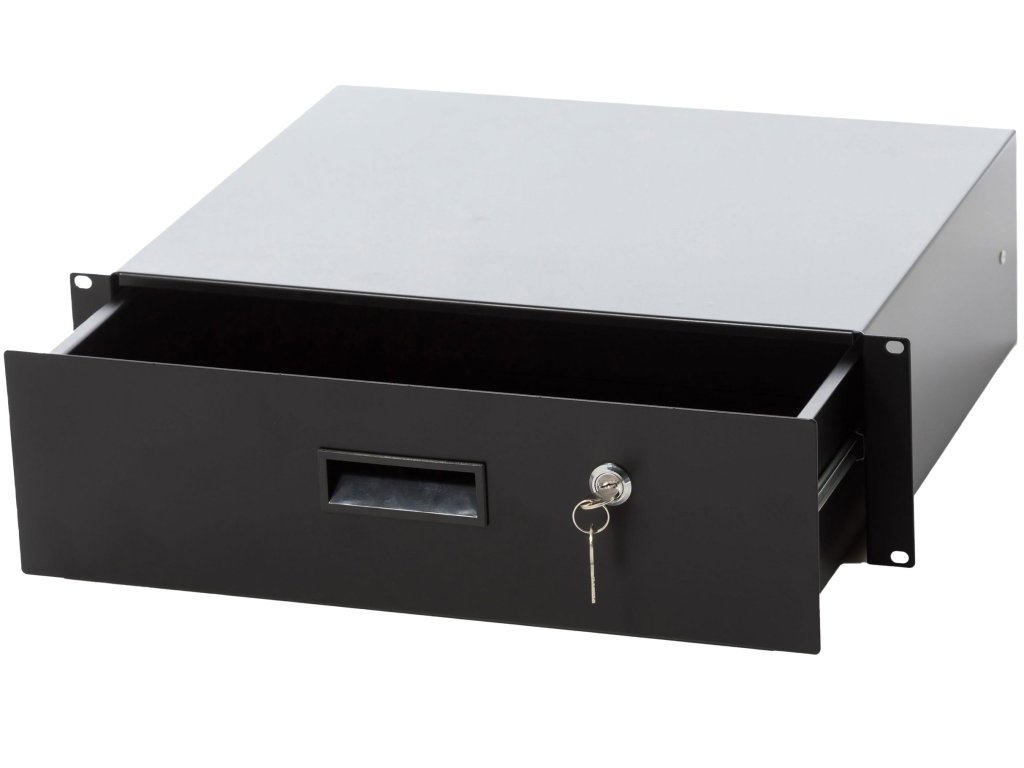 Zamykana, żelazna półka do szafy rack 19" 3U. Zawiera 3 oddzielne przegródki.