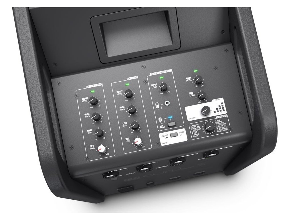 4-kanałowy mikser zawiera dwa wejścia mikrofonowe, z których pierwsze jest połączone z wejściem HiZ do podłączenia gitary elektrycznej. Kolejna para stereofonicznych wejść liniowych jest połączona z wejściem MP3 na minijack oraz bezprzewodowym połączeniem Bluetooth. Wejścia mikrofonowe posiadają, oprócz regulacji głośności, 2-pasmowy EQ i jednostkę DFX. Do wyboru jest 16 typów efektów, takich jak hall, vocal, delay, chorus. Ponadto można ustawić całkowitą głośność, poziom subwoofera i presety DSP satelitów.