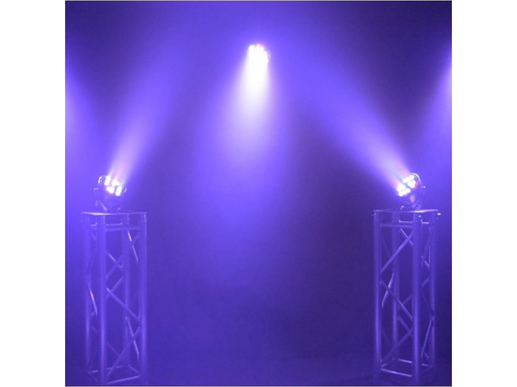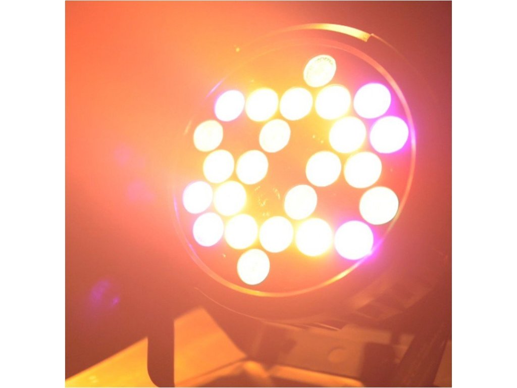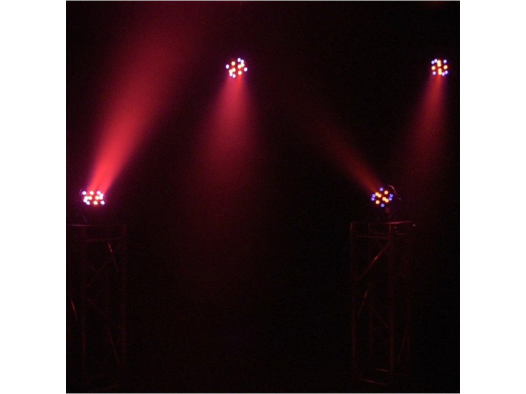 Reflektor LED PAR firmy LIGHT4ME. Urządzenie jest wyposażone w 30 diod LED o mocy 3 W (czerwona, zielona, niebieska, pomarańczowa) oraz światło UV. Reflektor zapewnia efekt zmiany kolorów, ściemniania kolorów, tryb automatyczny, sterowanie dźwiękiem, statyczne kolory i stroboskop. Reflektor może być umieszczony na płaskiej powierzchni, a także na wspornikach za pomocą uniwersalnej konsoli montażowej.