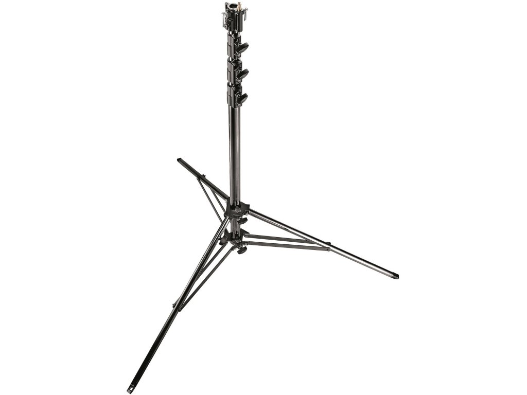 Czarny, czterosekcyjny statyw oświetleniowy ze stali chromowej o maksymalnej wysokości 477 cm i udźwigu do 40 kg, wysokość złożonego statywu 144 cm.