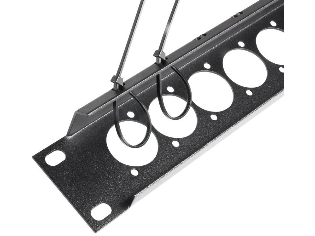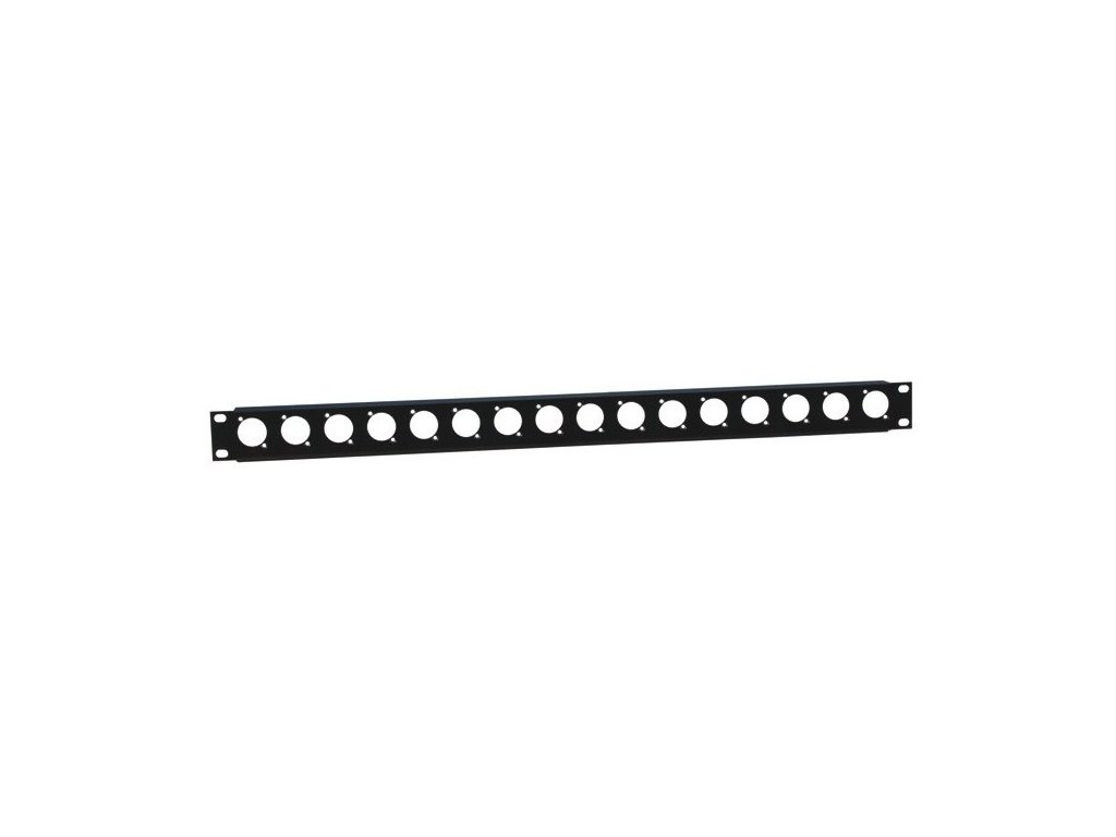 Panel rack 1 U z perforowanymi otworami na 16 uniwersalnych gniazd XLR typu "D". Z zintegrowanym odciążeniem. Zintegrowana listwa mocująca.