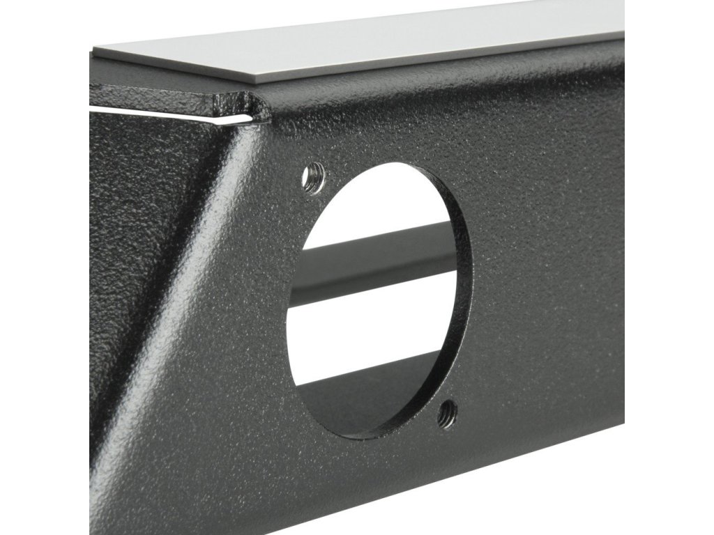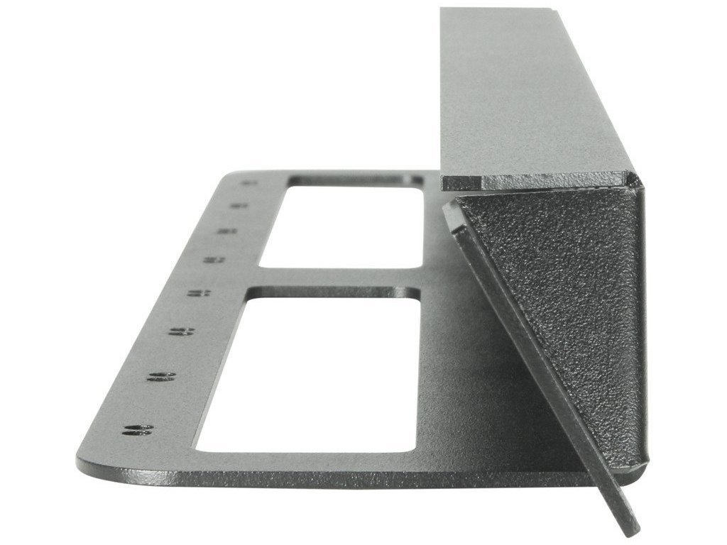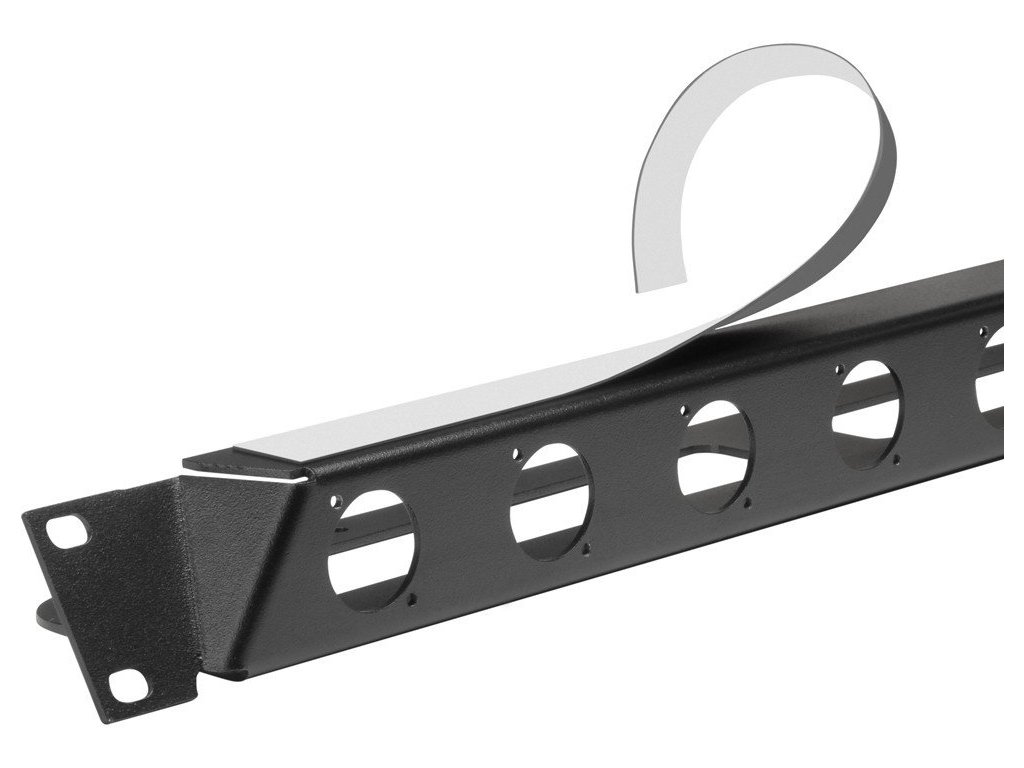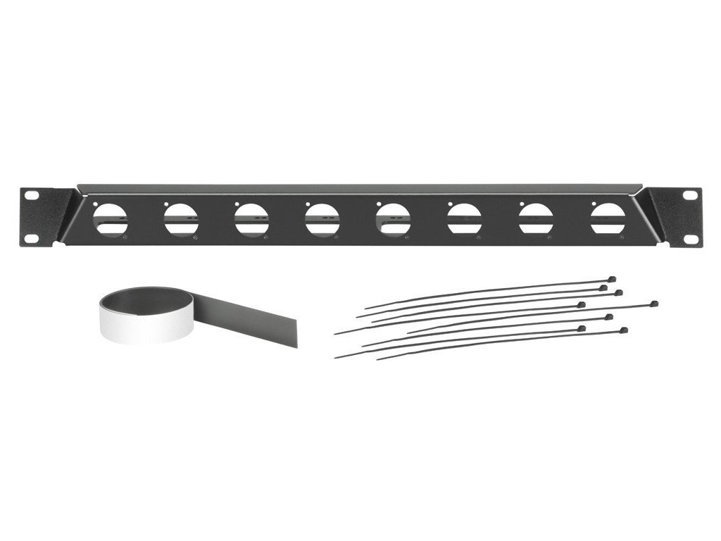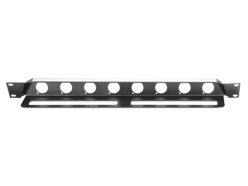Panel kątowy rack 19" z 8 wycięciami na gniazda typu D - z tylną listwą odciążającą naprężenia. Otwory montażowe są wyposażone w gwinty M3; kąt nachylenia wynosi 30°. Przednia górna powierzchnia jest przeznaczona na etykiety - magnetyczna listwa opisowa jest częścią dostawy.