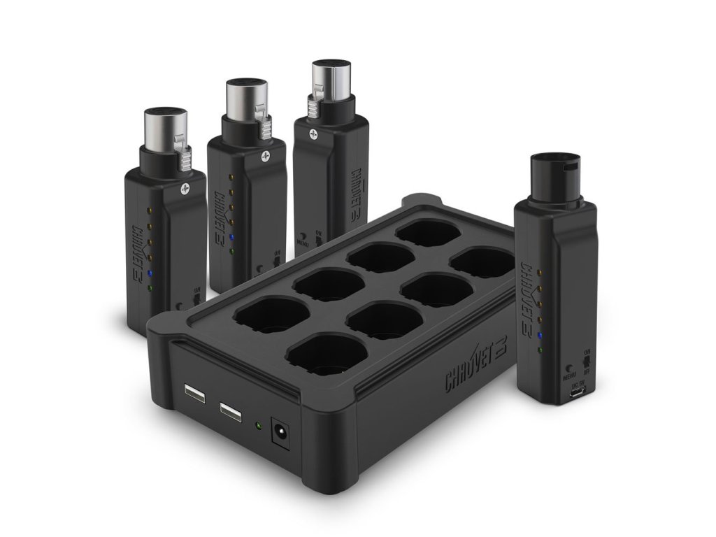 Spraw, aby każde światło kompatybilne z DMX było sterowane bezprzewodowo! Cuda bezprzewodowego sterowania DMX dotarły do wcześniej łączonych kablami świateł dzięki D-Fi XLR. Ta najnowocześniejsza technologia zapewnia natychmiastową komunikację bezprzewodową za pośrednictwem kompaktowych bezprzewodowych odbiorników lub nadajników D-Fi, które podłączają się bezpośrednio do portu XLR świateł kompatybilnych z DMX. Styki zasilają wszystkie D-Fi XLR bez potrzeby stosowania jakichkolwiek kabli. D-Fi XLR Pack zawiera 1 nadajnik, 3 odbiorniki i 1 multiładowarkę. Multiładowarka ładuje jednocześnie do 8 D-Fi XLR (dodatkowe jednostki sprzedawane oddzielnie). D-Fi XLR Pack ma nawet 2 dodatkowe porty USB do ładowania innych urządzeń.