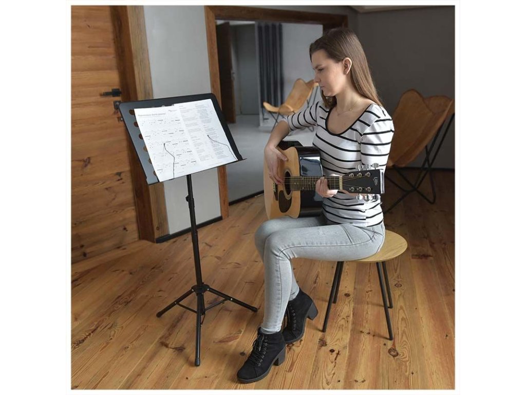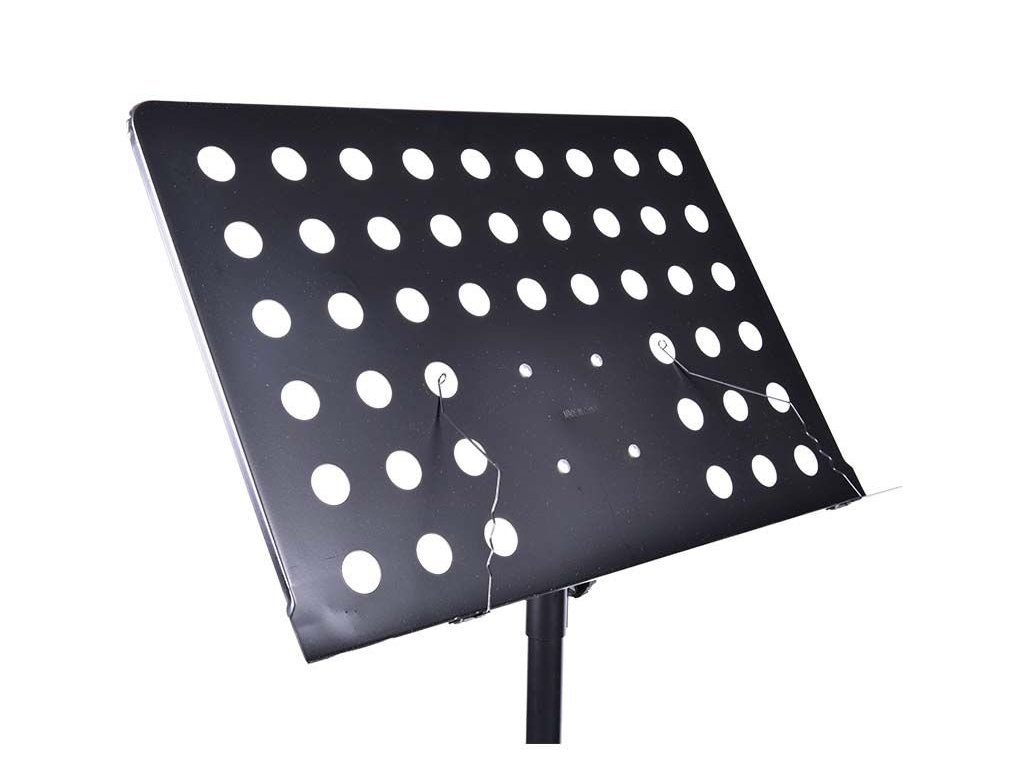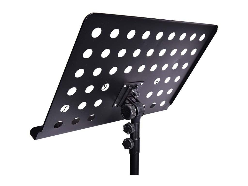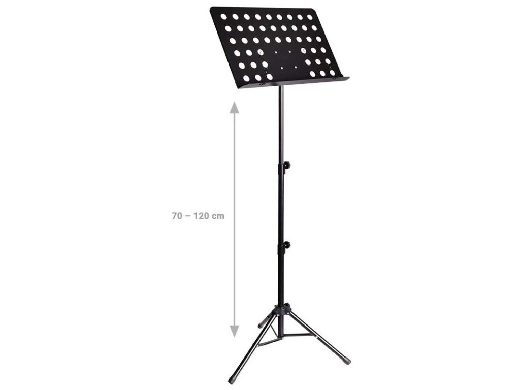 NN D5 to bardzo solidny, profesjonalny statyw na nuty z pokrowcem. Ten statyw muzyczny jest w całości wykonany z lekkiego aluminium i mocnego tworzywa sztucznego łączącego poszczególne elementy. Statyw posiada dwupunktową regulację wysokości w zakresie od 70 do 120 cm, co umożliwia wygodne czytanie tekstów piosenek lub nut zarówno na siedząco, jak i na stojąco. Kąt nachylenia powierzchni roboczej do użytkownika jest regulowany, a jej głębokość pozwala na umieszczenie nawet grubych segregatorów, co czyni go idealnym statywem na nuty dla zespołu weselnego lub solisty. Stosunkowo szeroka, trójnożna podstawa z gumowymi podkładkami sprawia, że cały statyw jest bardzo stabilny. Po złożeniu zajmuje mało miejsca, a dołączony pokrowiec transportowy z wodoodpornej codury umożliwia jego wygodny transport.