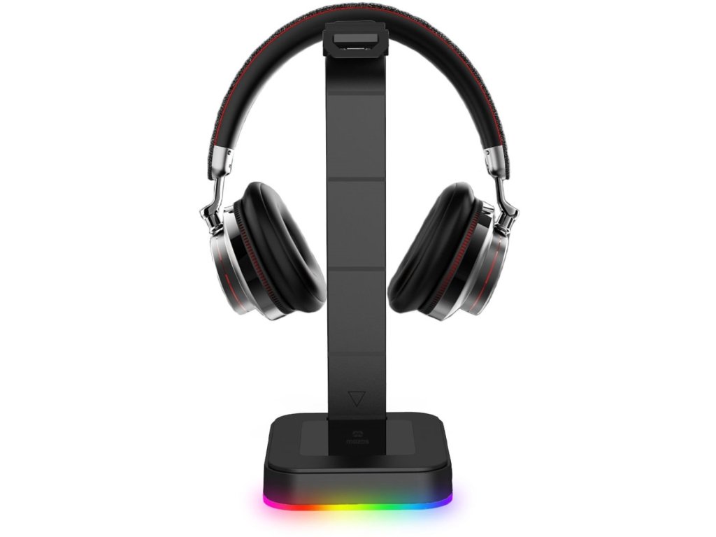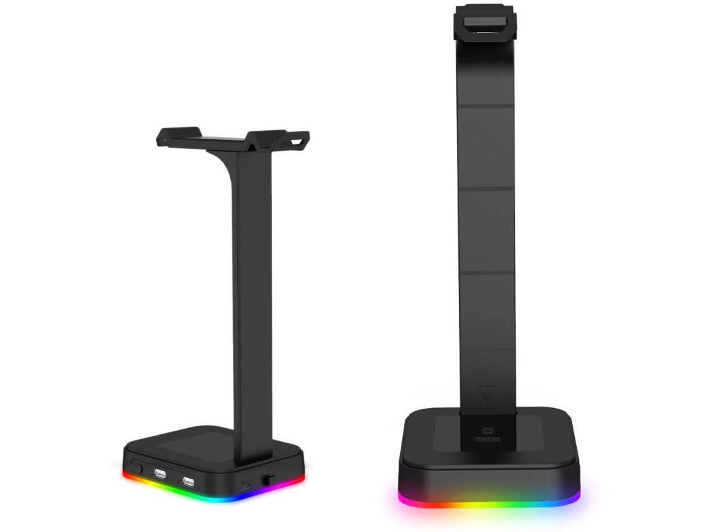 Stylowy uchwyt na słuchawki z efektownym podświetleniem LED, odpowiedni do słuchawek gamingowych i bezprzewodowych zamkniętych. Konstrukcja z regulacją wysokości zawiera dodatkowo wejście USB C do podłączania smartfonów lub dysków zewnętrznych oraz dwa porty USB A do zasilania urządzeń.