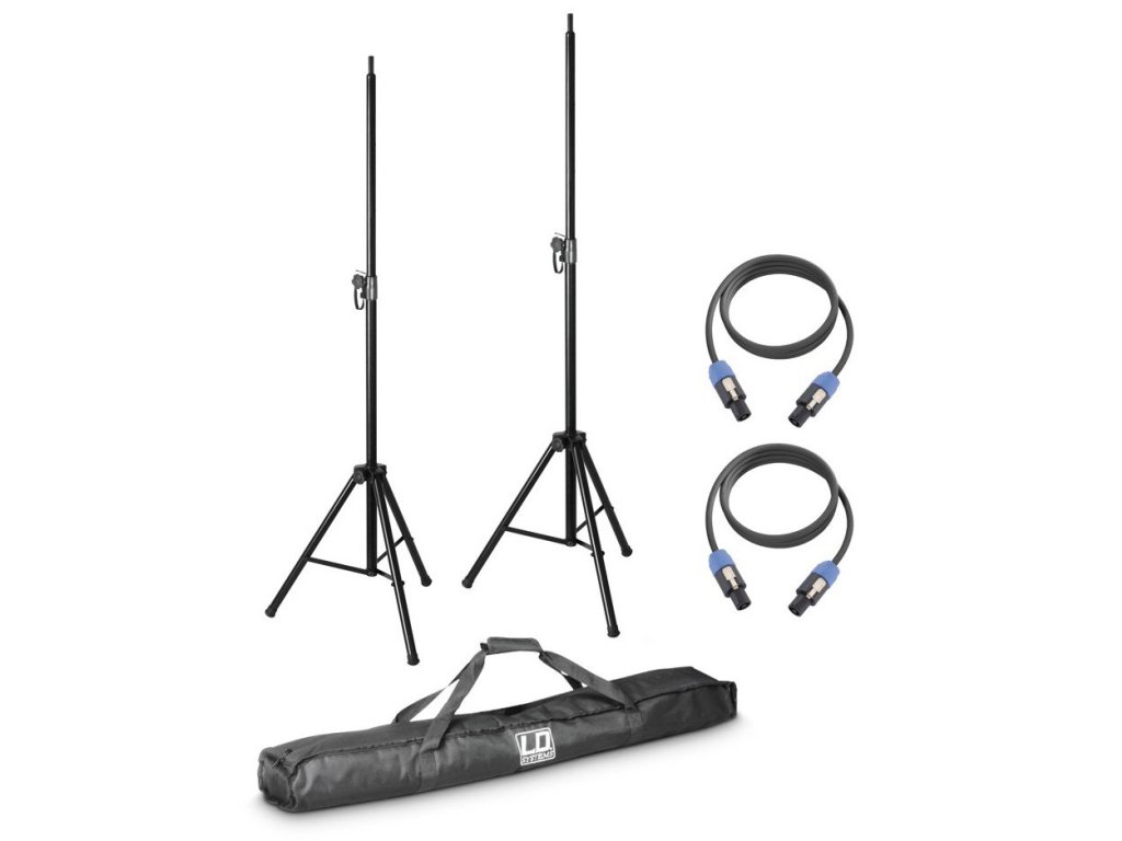 Zestaw statywów głośnikowych. Zawiera 2 szt. statywu głośnikowego z torbą transportową + 2 x kable głośnikowe (5 m).