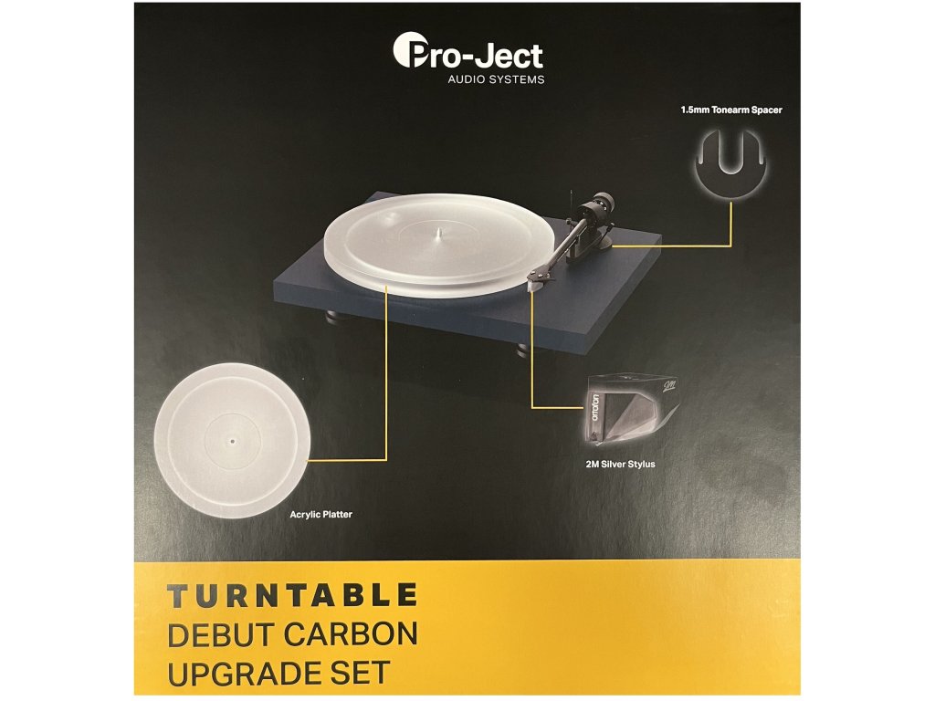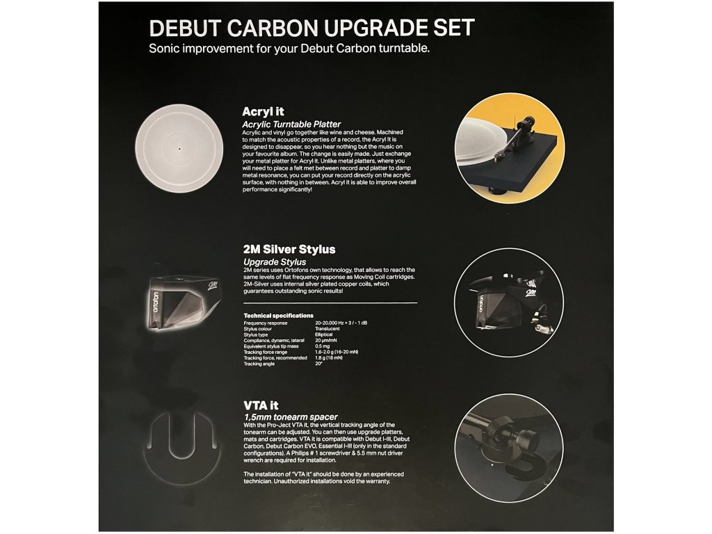 Jeśli chcesz poprawić jakość dźwięku swojego gramofonu Pro-Ject Debut Carbon, ten zestaw akcesoriów może być najprostszym rozwiązaniem. Do wymiany talerza nie są potrzebne żadne specjalne umiejętności, a instalacja jest bardzo prosta. Podczas wymiany istniejącej wkładki (oryginalnie dostarczana Ortofon 2M-Red) na lepszą 2M-Silver wymagane jest już dokładne ustawienie i wyrównanie. Korzyść dźwiękowa jest naprawdę odczuwalna. Podkładka dystansowa VTA it wymaga specjalistycznej wiedzy na temat ustawienia ramienia, dlatego instalację „VTA it” powinien przeprowadzić doświadczony technik. Nieautoryzowane instalacje powodują utratę gwarancji gramofonu.