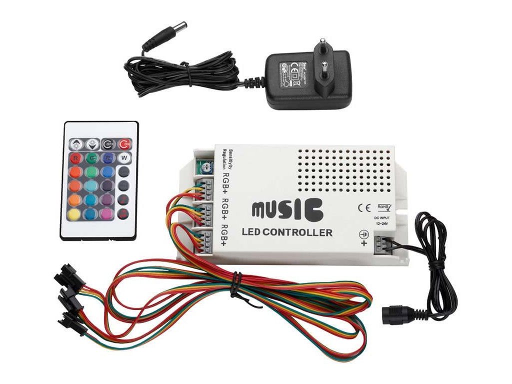 Kontroler współpracuje z taśmami LED, które świecą do 144 W i możesz kontrolować poziom jego czułości na dźwięki otoczenia. Możesz go również użyć do sterowania kolorowymi żarówkami LED.