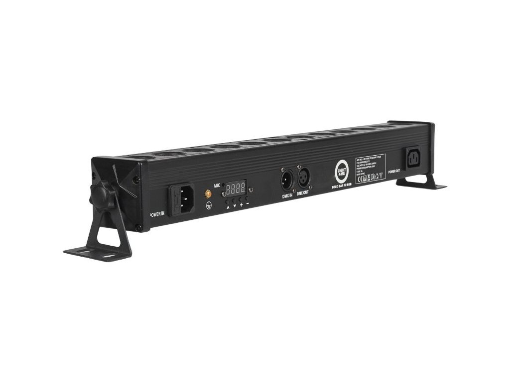 Listwa LED Light4Me Deco Bar jest wyposażona w 12 wydajnych diod LED o mocy 3 W (po 3 w 4 sekcjach), które pracują ze światłem w palecie kolorów RGB (czerwony, zielony, niebieski). Efekt gradientu kolorów RGB, dynamiczne efekty i stroboskop z regulowaną prędkością ułatwiają użytkownikowi uruchamianie gotowych, spektakularnych efektów wizualnych. Dołączony ergonomiczny bezprzewodowy pilot na podczerwień (IR) umożliwia użytkownikom bezproblemową regulację ustawień urządzenia w zależności od potrzeb, bez konieczności używania przycisków na obudowie. Urządzenie jest wyposażone w ściemniacz o pełnym zakresie, który umożliwia precyzyjne dostrojenie jasności do potrzeb Twojego pokazu świetlnego. Light4Me Deco Bar to urządzenie o stopniu ochrony IP20, co oznacza, że jest chronione przed wnikaniem ciał stałych o średnicy 12,5 mm i większych. Na tylnym panelu znajdują się złącza zasilania IEC (w tym tak zwane "power linking", które umożliwia nam przesyłanie zasilania bezpośrednio z urządzenia na urządzenie), wejście i wyjście DMX oraz panel sterowania z cyfrowym wyświetlaczem i czterema przyciskami. Za ich pomocą możemy zmieniać ustawienia w menu, a także wybrać jeden z czterech trybów pracy: