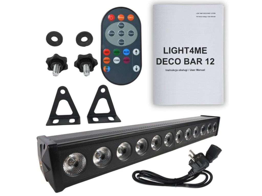 Light4Me Deco Bar 12 RGB to profesjonalny bar LED z bezprzewodowym pilotem IR do dekoracji świetlnych i tworzenia efektów scenicznych. Idealnie nadaje się do oświetlenia na koncertach, występach scenicznych, w salach weselnych, klubach tanecznych i dyskotekach, a także w pubach, hotelach, restauracjach oraz jako oświetlenie dla DJ-ów, zespołów i firm organizujących imprezy.