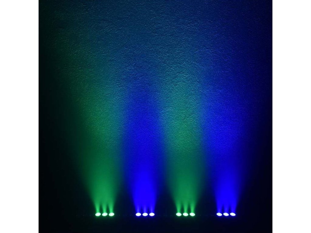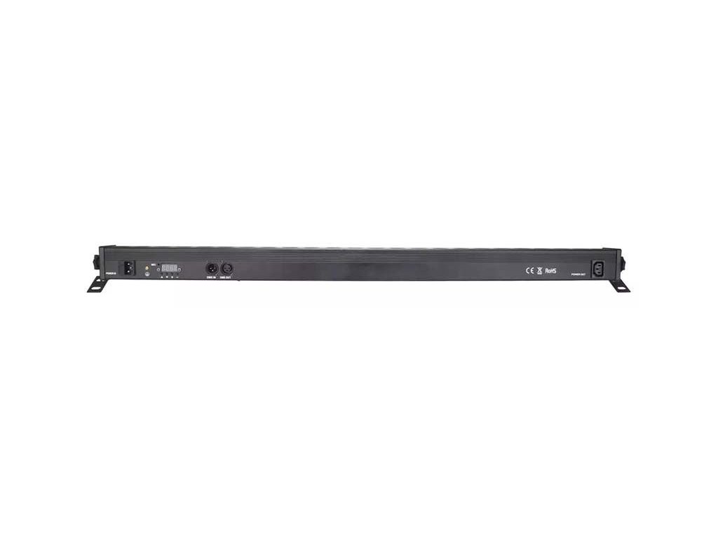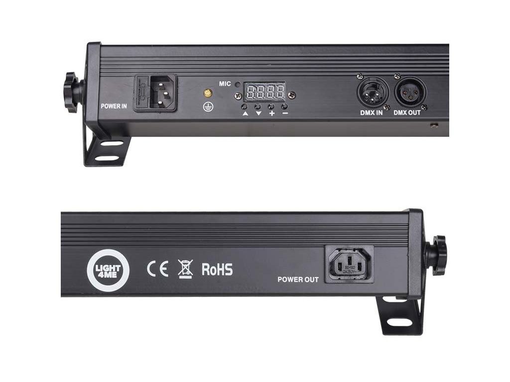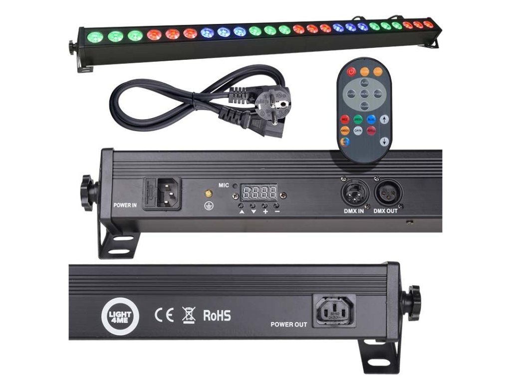 Light4Me Deco Bar 24 RGB IR jest wyposażony w 24 wydajne diody LED 3W (8 sekcji po 3 diody), które pracują ze światłem w palecie kolorów RGB. Tylny panel jest wyposażony w złącza zasilania IEC (IN/OUT) umożliwiające podłączenie zasilania bezpośrednio z urządzenia do urządzenia, złącza DMX (IN/OUT) oraz panel sterowania z cyfrowym wyświetlaczem i czterema przyciskami. Za ich pomocą możemy zmieniać ustawienia w menu i wybierać tryb pracy.