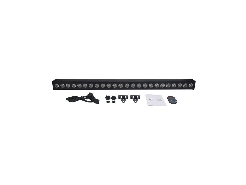 LIGHT4ME Deco Bar 24 RGBA IR to profesjonalna listwa LED z 24 wydajnymi diodami LED o mocy 3 W (3 diody w 8 sekcjach) w palecie kolorów RGBA (czerwony, zielony, niebieski, bursztynowy). Oferuje szerokie możliwości zastosowania, od koncertów i występów scenicznych po oświetlenie sal weselnych, klubów lub restauracji. Ten LED bar można łatwo kontrolować za pomocą podczerwonego bezprzewodowego pilota lub poprzez protokół DMX, co umożliwia elastyczne sterowanie efektami świetlnymi i dostosowanie do różnych scen i wymagań.