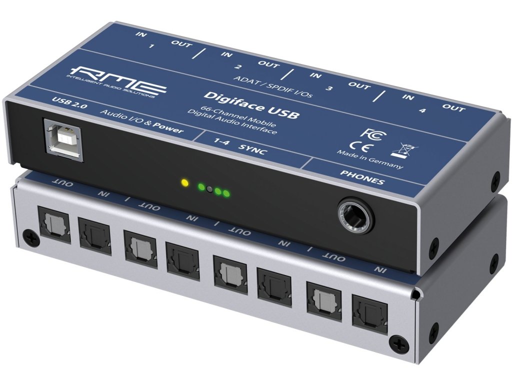 Digiface USB oferuje 4 optyczne interfejsy ADAT/S/PDIF in/out oraz wysokiej jakości analogowe wyjście stereo do monitoringu - może być używane jako liniowe i słuchawkowe. Urządzenie jest zasilane bezpośrednio z magistrali USB komputera. Każdy z czterech portów oferuje optyczny interfejs w ośmiokanałowym formacie ADAT lub dwukanałowym S/PDIF - można go oddzielnie przełączać na każdym porcie. Obsługiwane jest multipleksowanie kanałów SúMUX, dzięki czemu można osiągnąć częstotliwość próbkowania do 192kHz kosztem zmniejszenia liczby kanałów. Aplikacja Total Mix umożliwia dowolne kierowanie kanałów input/playback/output, tworzenie submikserów itp. Wszystko z zerową latencją. Total Mix może być sterowany za pomocą opcjonalnego kontrolera ARC USB,