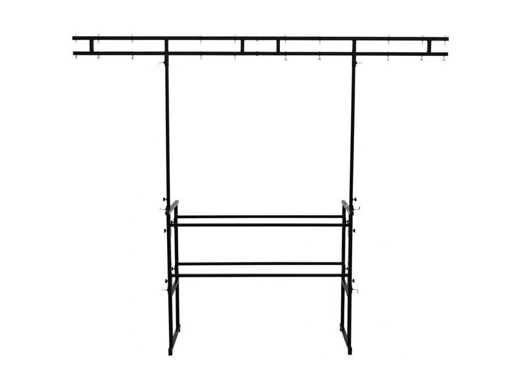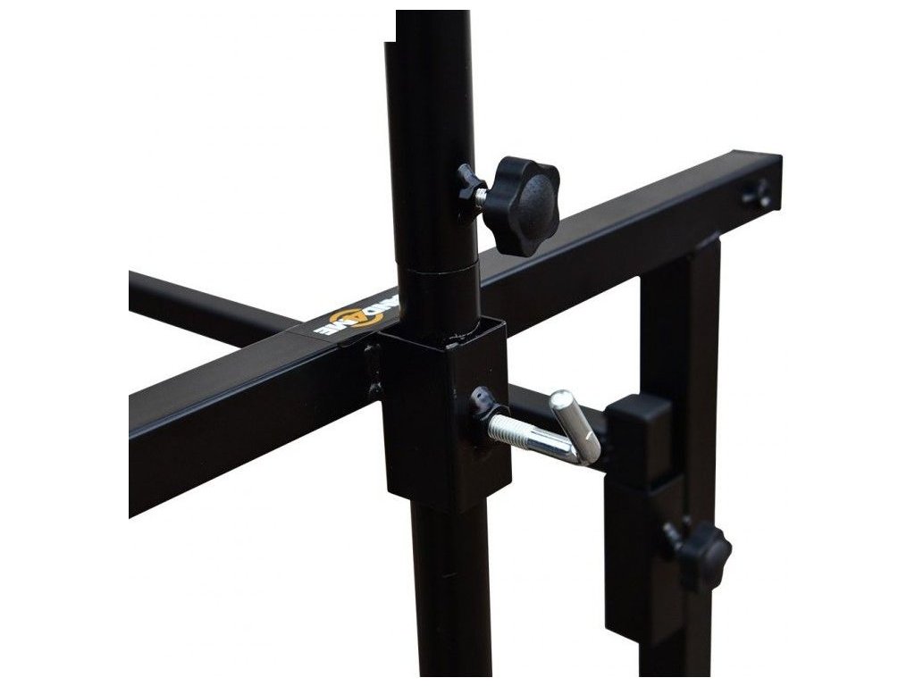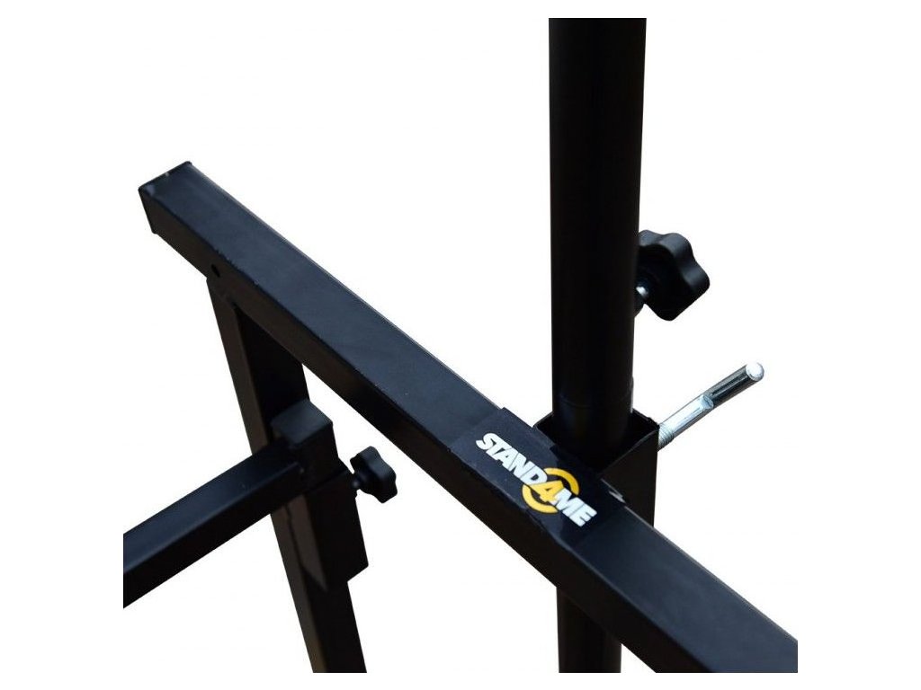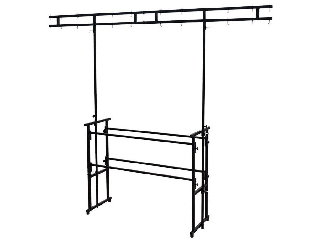 STAND4ME DJ120 DUO to wysokiej jakości uniwersalny stojak DJ, który jest idealnym rozwiązaniem dla mobilnych DJ-ów. Cała konstrukcja ma 1,2 m szerokości i jest wystarczająco mocna, aby utrzymać większość mobilnego sprzętu scenicznego. Rama jest wyposażona w dwie półki. Górna z nich jest przeznaczona na konsole i miksery. Dolna jest idealna do umieszczenia wzmacniaczy, procesorów dźwięku lub kontrolerów oświetlenia. Podwójna rampa oświetleniowa ma 260 cm szerokości, a po złożeniu 220 cm wysokości. Posiada również 20 otworów montażowych, które pasują do prawie wszystkich efektów świetlnych, reflektorów lub innego sprzętu. Łatwy transport zapewnia opcjonalna torba transportowa (nie jest dołączona do zestawu). Jest to idealny stojak, szczególnie dla mobilnych DJ-ów.