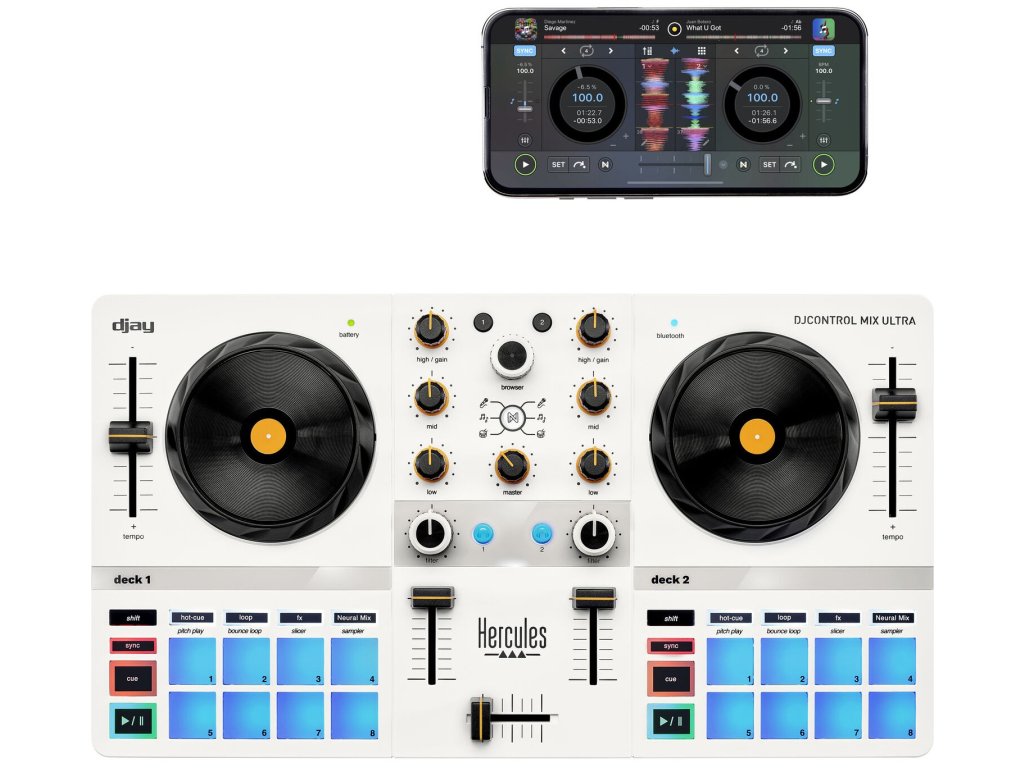 DJControl Mix Ultra został zaprojektowany dla DJ-ów, którzy chcą mieć swój mikser zawsze pod ręką. Dzięki bezprzewodowemu połączeniu przez Bluetooth® Low Energy kontroler można łatwo połączyć ze smartfonami i tabletami z systemem iOS i Android, a sterowanie odbywa się za pośrednictwem aplikacji djay. Dzięki kompaktowym wymiarom 32,2 x 19,7 cm, DJControl Mix Ultra z łatwością mieści się w plecaku, a osłona ochronna chroni go podczas transportu. Dodatkowo osłona ta może służyć jako praktyczna podstawka pod smartfona, co zapewnia wygodniejsze użytkowanie. Wbudowany akumulator umożliwia do 10 godzin ciągłego miksowania bez konieczności podłączania do zasilania.
