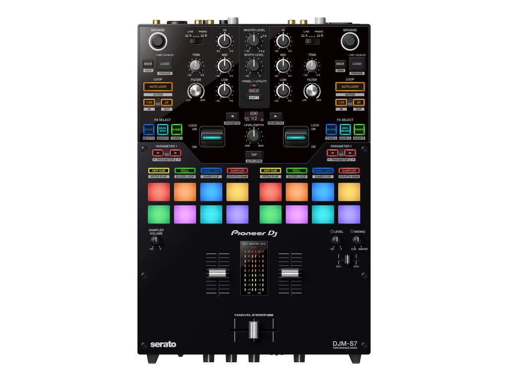 DJM-S7 to 2-kanałowy scratch mikser, który podkreśli Twój styl gry. Po podłączeniu odblokowuje pełną wersję Serato DJ PRO i Rekordbox DVS, dzięki czemu możesz wybierać między tymi programami.