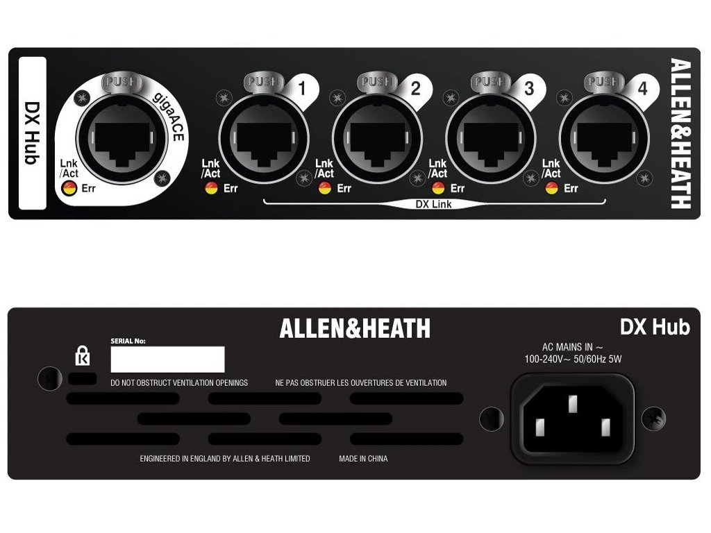 DX Hub to interfejs sieciowy do dystrybucji sygnału audio, współpracujący ze wszystkimi produktami dLive z kartą gigaACE. Oferuje 4 porty DX link (każdy o pojemności 32x32 ścieżki), dzięki którym można podłączyć dLive (lub SQ) do ekspanderów DX.
