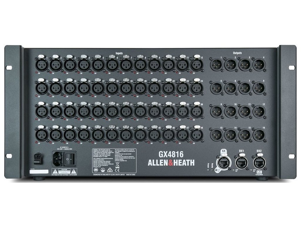Każdy rack GX4816 jest wyposażony w 48 przedwzmacniaczy mikrofonowych z niezależnym wskaźnikiem zasilania fantomowego. Ponadto znajdują się tutaj 2 porty DX, do których można szeregowo podłączyć do 4 ekspanderów DX dla dodatkowych wejść i wyjść. Można również podłączyć osobisty system monitoringu ME (przez złącze DX2).