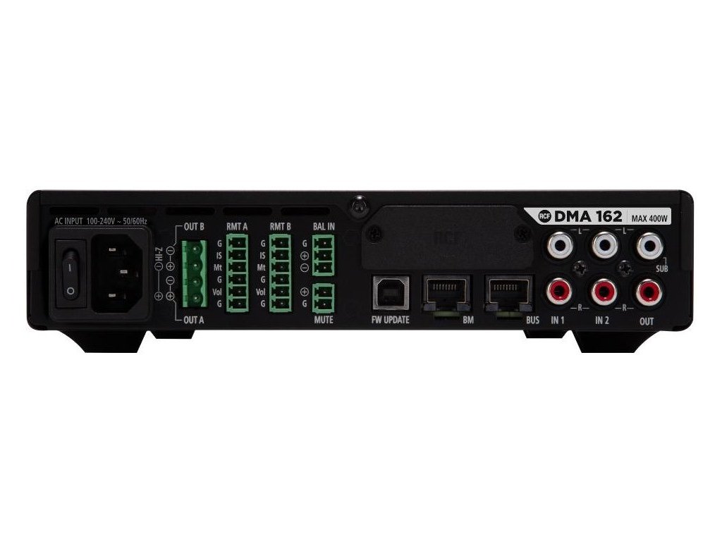 DMA 162 to dwukanałowy wzmacniacz matrycowy klasy D wyposażony w wydajną platformę DSP, która umożliwia zarządzanie wejściami i wyjściami pod względem routingu i korekcji (dostępny jest pełny zestaw funkcji przetwarzania, w tym PEQ, filtry FIR, podbicie basów, limitery, kompresory i korekcja otoczenia); dodatkowo zaimplementowano specjalne presety dla głośników RCF, które optymalizują ich wydajność akustyczną. Może dystrybuować 4 kanały audio do jednostek DMA 162P za pośrednictwem analogowej szyny audio BUS, łącząc w ten sposób elastyczną i skalowalną architekturę dla wielu pomieszczeń z łatwym podłączeniem i instalacją. Jego konfiguracja jest prosta i przyjazna dla użytkownika i można ją przeprowadzać za pomocą elementów sterujących na panelu przednim (z wyświetlaczem OLED) lub za pośrednictwem sieci RDNet. Dzięki swojej elastyczności instalacyjnej, precyzyjnemu projektowi i solidności idealnie nadaje się do szerokiej gamy komercyjnych zastosowań muzycznych i instalacyjnych systemów dźwiękowych.