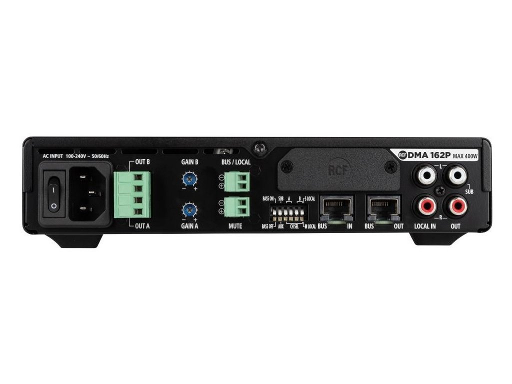 DMA 162P to dwukanałowy wzmacniacz mocy klasy D wyposażony w wydajną platformę DSP. Jego naturalne zastosowanie to połączenie z jednostką DMA w celu zwiększenia zainstalowanej mocy i realizacji architektury wielopomieszczeniowej dla komercyjnych systemów audio. Jego zdolność adaptacji, narzędzia sterujące i dostępne wejścia umożliwiają jednak użycie jako samodzielnego wzmacniacza: dodanie opcjonalnej karty RDNet pozwala użytkownikowi zarządzać wszystkimi funkcjami DSP i wybrać konkretne ustawienia głośników RCF. Dzięki wyjątkowo kompaktowym rozmiarom, precyzyjnej konstrukcji i solidności idealnie nadaje się do szerokiej gamy firmowych aplikacji muzycznych.