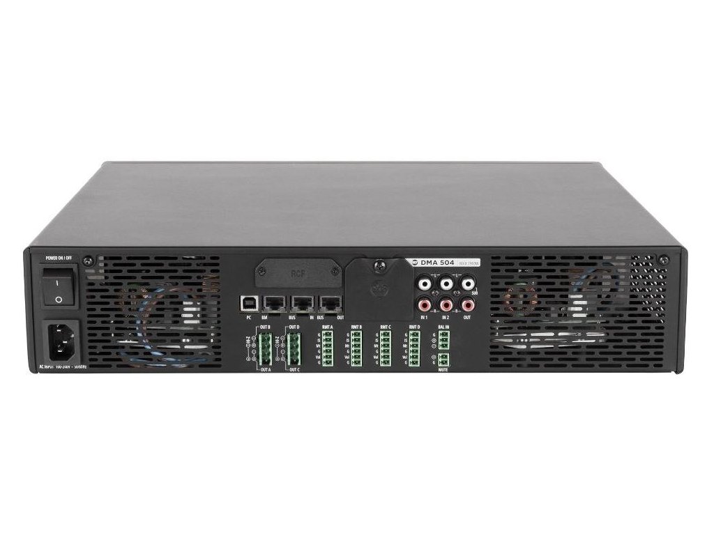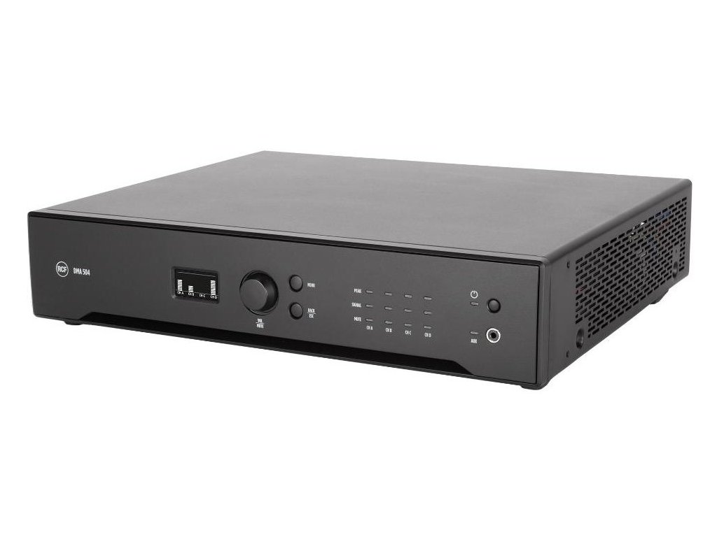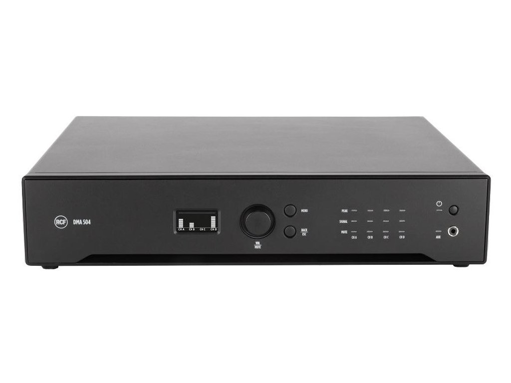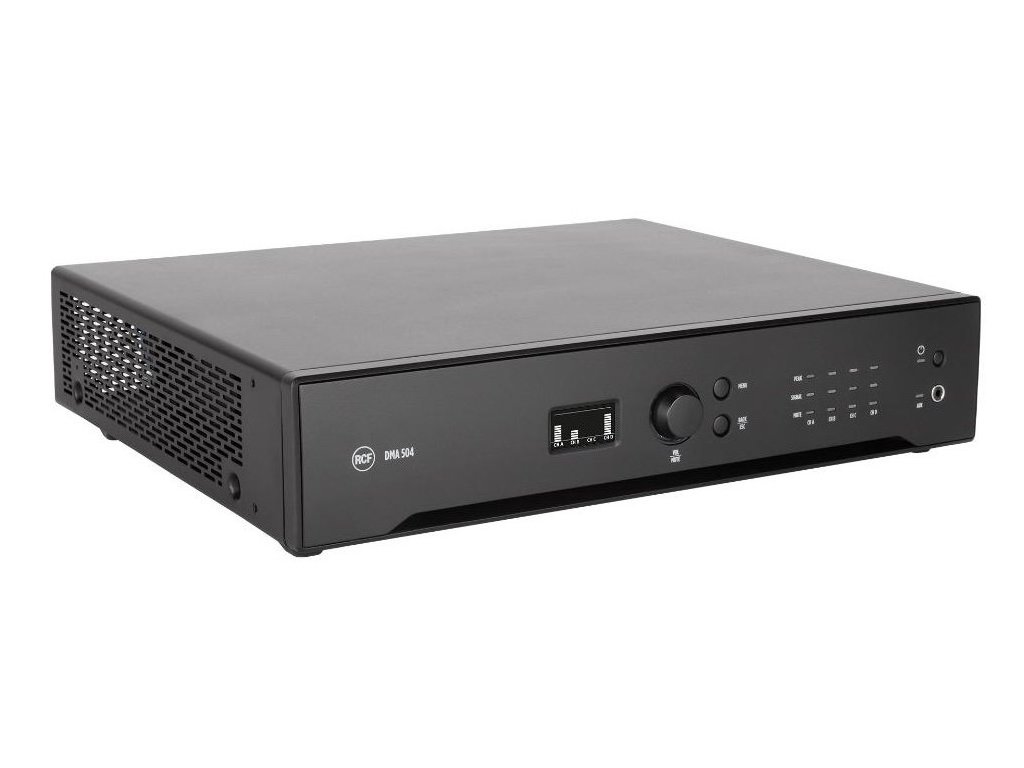 DMA 504 to czterokanałowy wzmacniacz klasy D, który zapewnia 4 wyjścia o mocy 500 W każde. Jest wyposażony w wydajną platformę DSP, która umożliwia sterowanie wejściami i wyjściami pod względem kierowania i equalizacji. Kompletny zestaw funkcji przetwarzania obejmuje PEQ, filtry FIR, podbicie basów, limitery, kompresory i equalizację otoczenia. Dla optymalnej wydajności akustycznej i niezawodności, na każdym kanale dostępne są presety dla głośników RCF. Może dystrybuować 4 kanały audio do innych jednostek za pośrednictwem analogowej magistrali audio BUS, łącząc elastyczną i skalowalną architekturę dla wielu pomieszczeń z łatwym podłączeniem i instalacją. Konfiguracja jest prosta i przyjazna dla użytkownika i można ją przeprowadzać za pomocą elementów sterujących na panelu przednim (z wyświetlaczem OLED) lub za pośrednictwem sieci RDNet. Dzięki swojej elastyczności podczas instalacji, precyzyjnej konstrukcji i solidności, DMA 504 jest idealny do szerokiej gamy zastosowań muzyki biznesowej i zainstalowanego dźwięku.