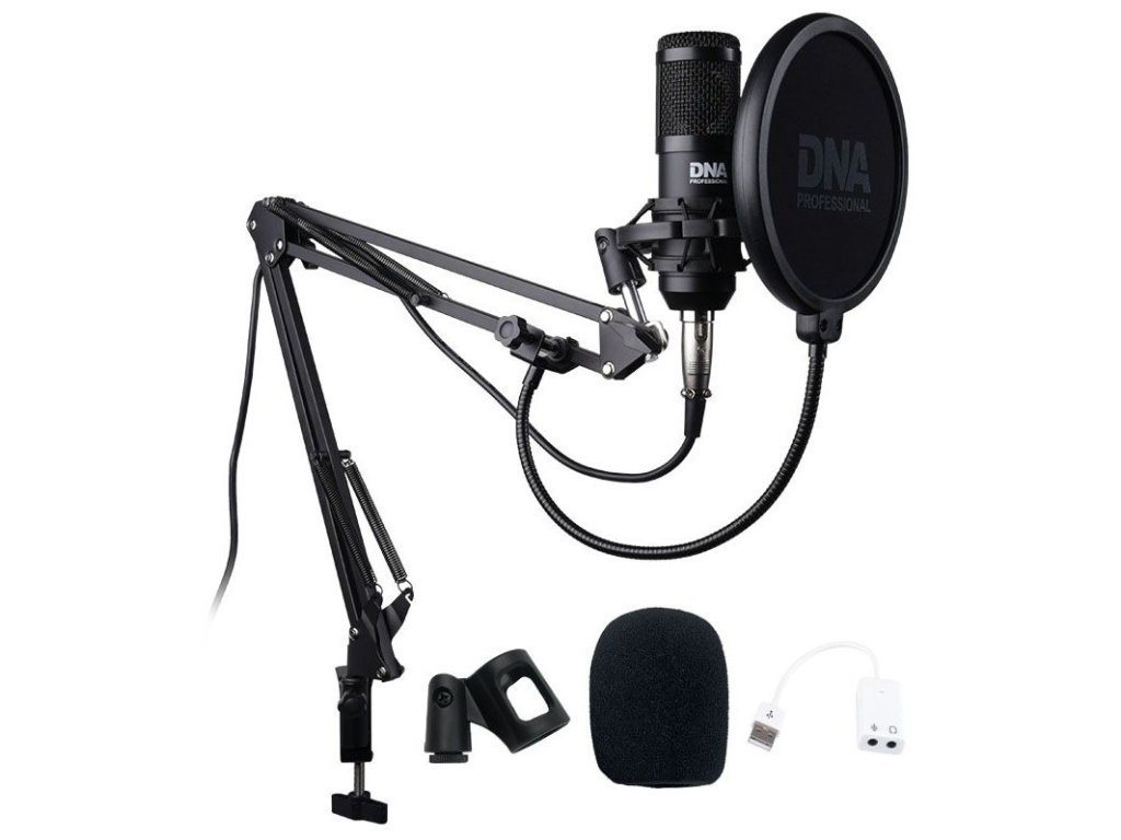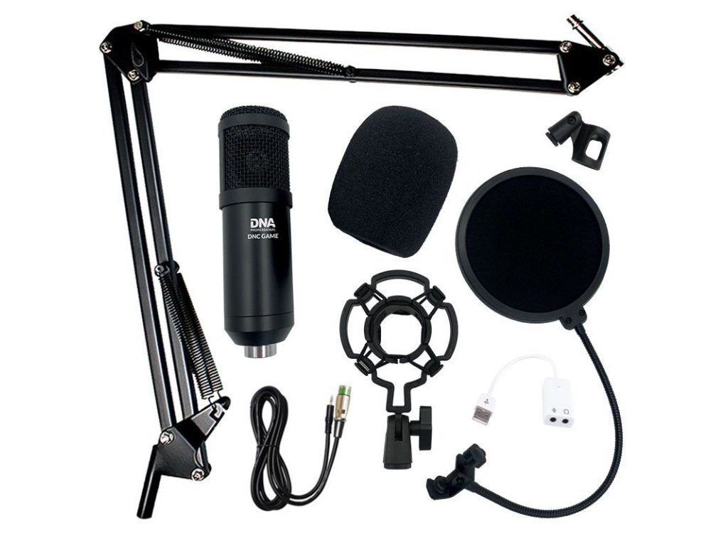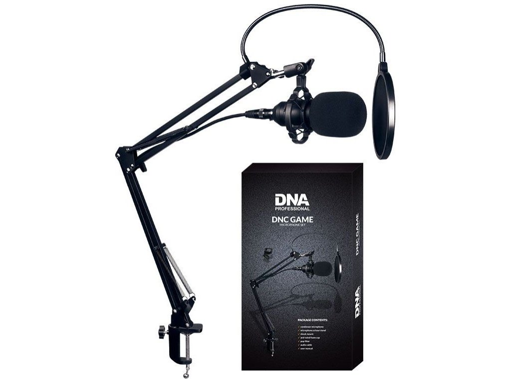 DNA DNC GAME to zestaw mikrofonu stołowego, który zawiera mikrofon pojemnościowy z koszem przeciwwstrząsowym, uchwyt przykręcany do blatu stołu, filtr przeciwwietrzny do mikrofonu i pop filtr na „gęsiej szyi”, który tłumi powstawanie tzw. sybilantów oraz kabel XLR-jack. Zestaw idealnie nadaje się do domowego studia nagrań, nagrywania w domu, stacji radiowych, a także do nagrywania podcastów, tekstów voice-over i instrumentów akustycznych. Szeroka odpowiedź częstotliwościowa, wysoka czułość i mikrofon jednokierunkowy sprawiają, że nagrywany obraz dźwiękowy jest bardzo dokładny. Ramię konsolowe o szerokim zakresie ruchów umożliwia precyzyjne umieszczenie mikrofonu względem źródła dźwięku w każdych warunkach. Jest to w pełni profesjonalny, a przy tym stosunkowo tani zestaw mikrofonowy do nagrywania renomowanej marki DNA.