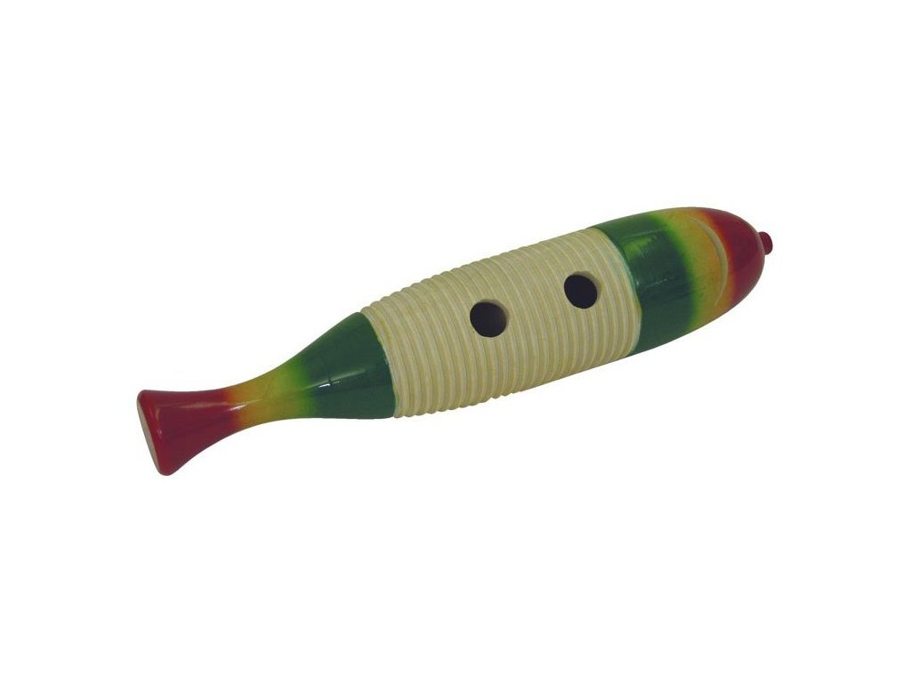 Guiro w kształcie ryby, duże. Materiał: drewno. Kolor: Mexico design. Bezbarwny lakier ochronny. Z skrobakiem.