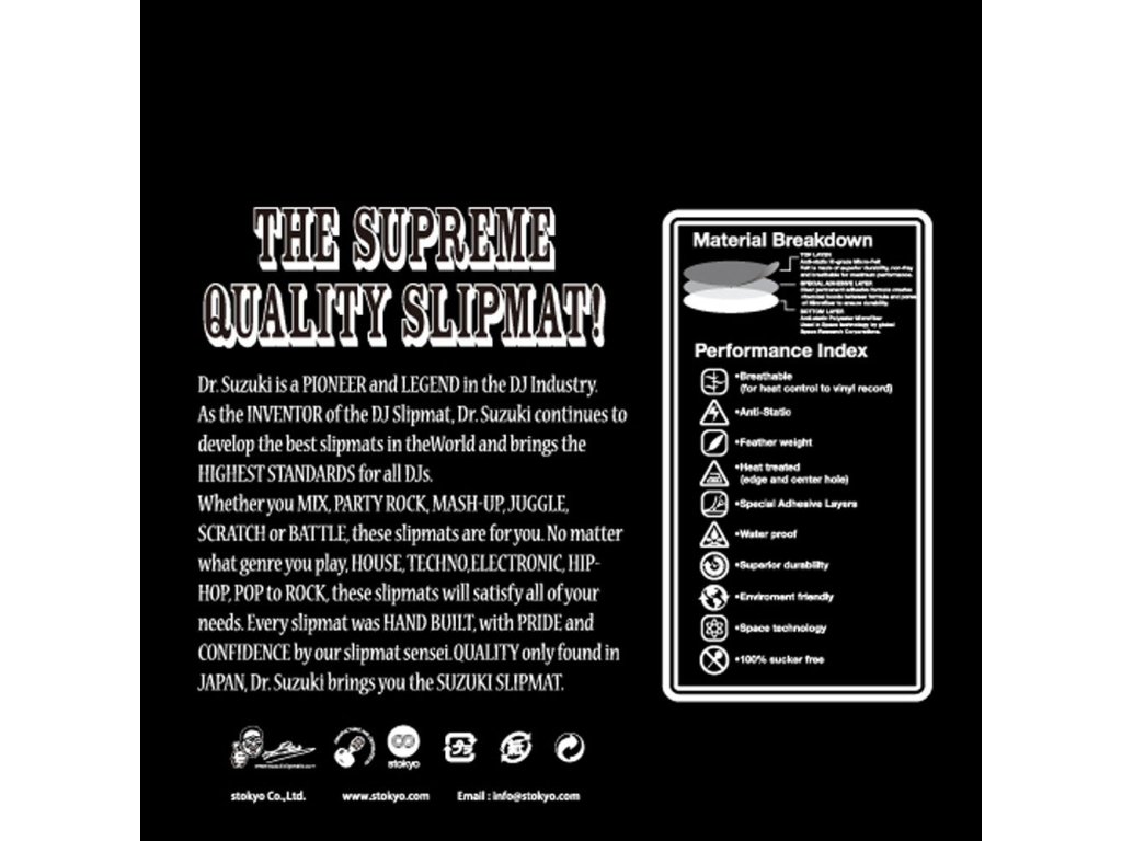 Wszystkie Dr. Suzuki Slipmats zostały specjalnie zaprojektowane, aby zapewnić doskonałą wydajność dla scratch dj-ów. Solidność Slipmatu redukuje szumy podczas manipulacji winylem i umożliwia płynniejszy ruch. Ponadto średnica Slipmatu jest mniejsza niż średnica normalnego winylu. Powinno to zapobiec przywieraniu winylu do Slipmatu z powodu ładunku statycznego.