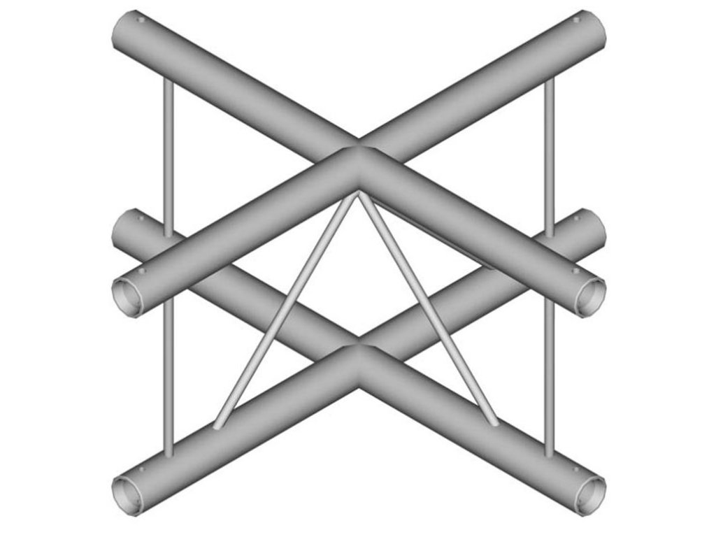 Narożny element konstrukcyjny umożliwiający budowę konstrukcji scenicznych do zawieszania instalacji oświetleniowych lub dźwiękowych. Element jest wygięty pionowo pod kątem 90° w kształcie litery X i wykonany z pary rur o średnicy 35 mm i grubości ścianki 2 mm. Konstrukcja wykonana jest ze stopu AlMgSi1, dzięki czemu każdy z elementów serii DT22 zachowuje niską wagę i wysoką wytrzymałość. Pręty wzmacniające mają średnicę 8 mm. Element jest wyposażony w końcówki do zasilania kolejnych elementów. W zestawie znajdują się również śruby i klamry zabezpieczające. Wymiary: 500 x 500 x 220 mm, waga: 2 kg.