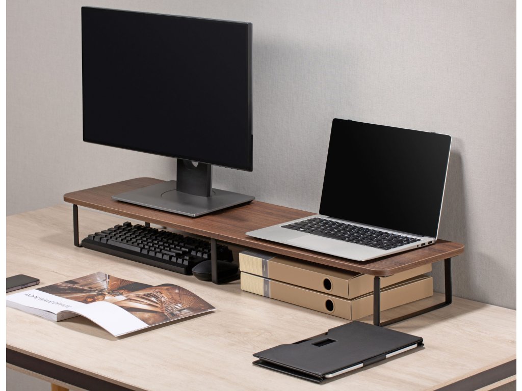 Stylowa i praktyczna podstawka pod dwa monitory lub do kombinacji monitora i notebooka. To idealne rozwiązanie dla studiów nagraniowych, nowoczesnych biur i domowych gabinetów. Ta podstawka efektywnie organizuje Twoją przestrzeń roboczą i przyczynia się do lepszej ergonomii.