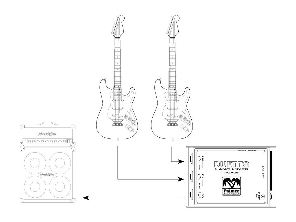 DUETTO umożliwia aktywne miksowanie dwóch źródeł razem na wspólnym wejściu wzmacniacza. Dla każdego wejścia dostępny jest potencjometr głośności, dzięki czemu można wzajemnie regulować różne poziomy. DUETTO jest zwykle używany, gdy nauczyciele gry na gitarze i uczniowie chcą grać przez wspólny wzmacniacz z tylko jednym wejściem. Możliwości wykorzystania są wszechstronne, na przykład mini mikser może być również używany jako sterownik kablowy, sumator mono lub przedwzmacniacz nagraniowy.