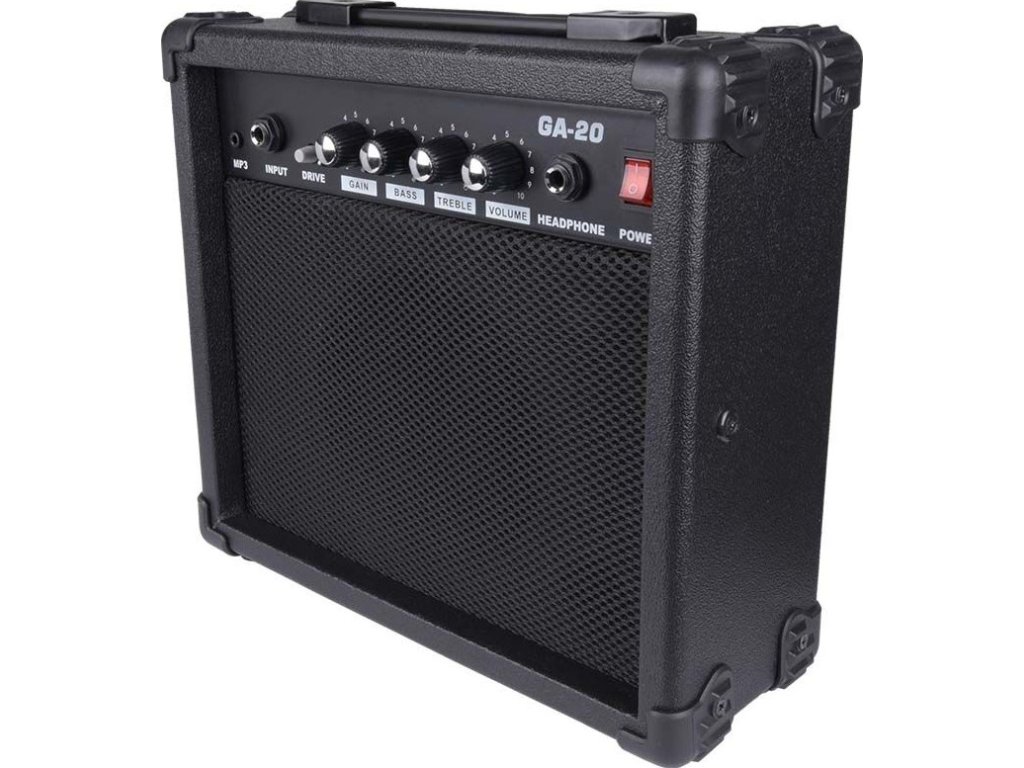 „Combo” gitarowe z zestawu EAG SET ma moc 18,6 W i wyjście słuchawkowe, dzięki czemu idealnie nadaje się do domowego grania, ale nie tylko. Głośnik o średnicy 5 cali został osadzony w klasycznej, czarnej obudowie. Nad nim znajduje się panel wzmacniacza z wejściem instrumentalnym mono typu jack 6,3 mm do podłączenia instrumentu do combo oraz wejściem MP3/AUX typu mini-jack do podłączenia zewnętrznego odtwarzacza. Dzięki tej opcji możesz uczyć się dowolnych utworów i grać na gitarze do podkładów muzycznych puszczonych w tle. Panel wzmacniacza zawiera 4 potencjometry do regulacji głośności, wzmocnienia sygnału (gain) oraz korekcji tonów wysokich i niskich. Naciśnięcie przełącznika Drive dodatkowo wzmocni sygnał gitary, co pozwoli uzyskać specyficzne, „brudniejsze” brzmienie charakterystyczne dla gatunków takich jak blues, rock czy metal.