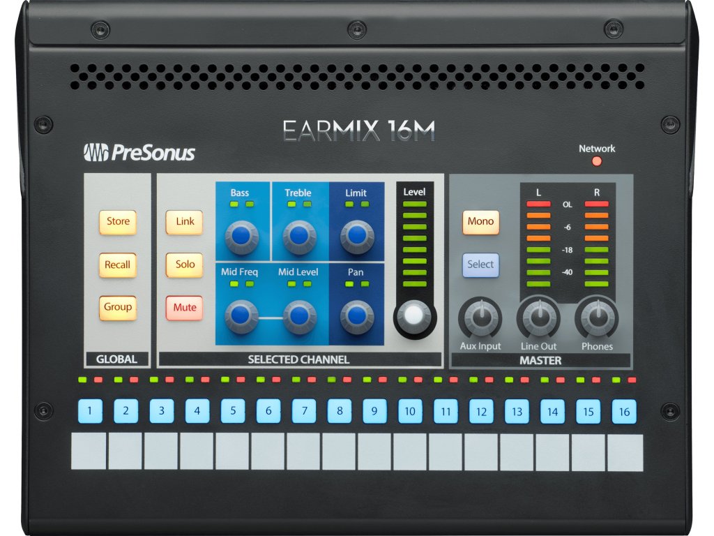 Osobisty sieciowy mikser monitorowy AVB PreSonus EarMixTM 16M, zaprojektowany do bezproblemowej integracji z systemem dźwiękowym opartym na platformie mikserskiej PreSonus StudioLive III generacji.