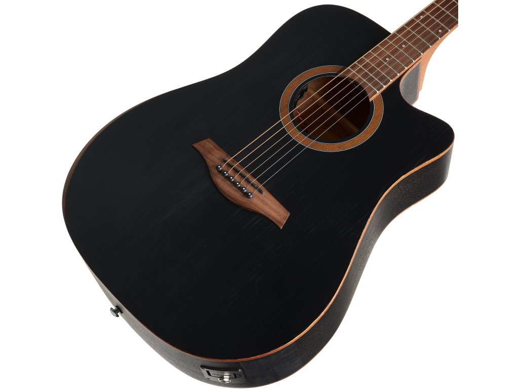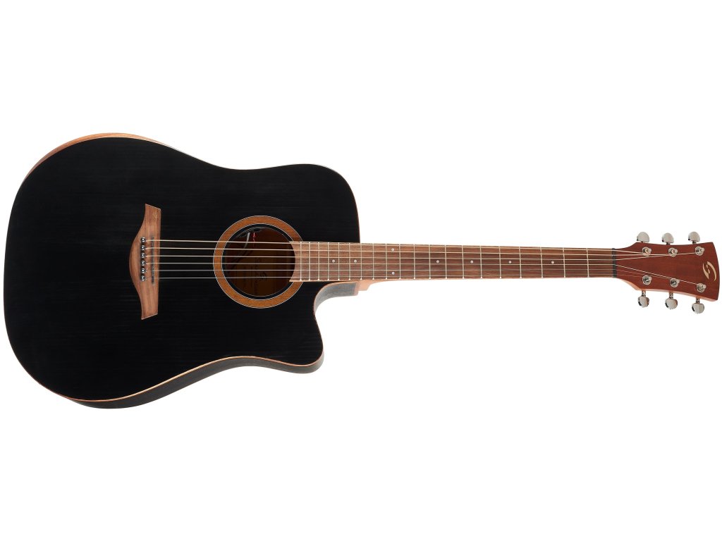 Soundsation EDGE ST DNCE-TBK to przystępna cenowo gitara elektroakustyczna z dużym rezonansowym korpusem typu Dreadnought, odpowiednia nie tylko dla początkujących graczy. Przednia płyta gitary wykonana jest ze sklejki świerkowej, tylna płyta i boki wykonane są ze sklejki sapele. Do gryfu z okoumé o przyjemnym profilu "C" przyklejona jest orzechowa podstrunnica z dwudziestoma progami. Dostęp do wyższych pozycji na podstrunnicy ułatwia dolne wycięcie korpusu.