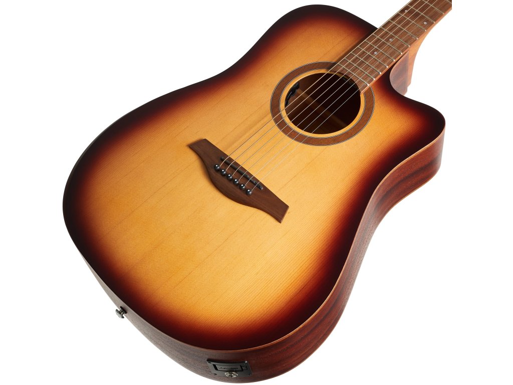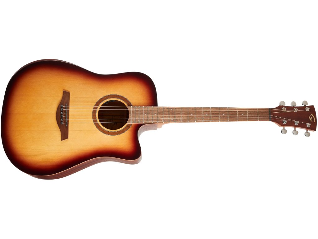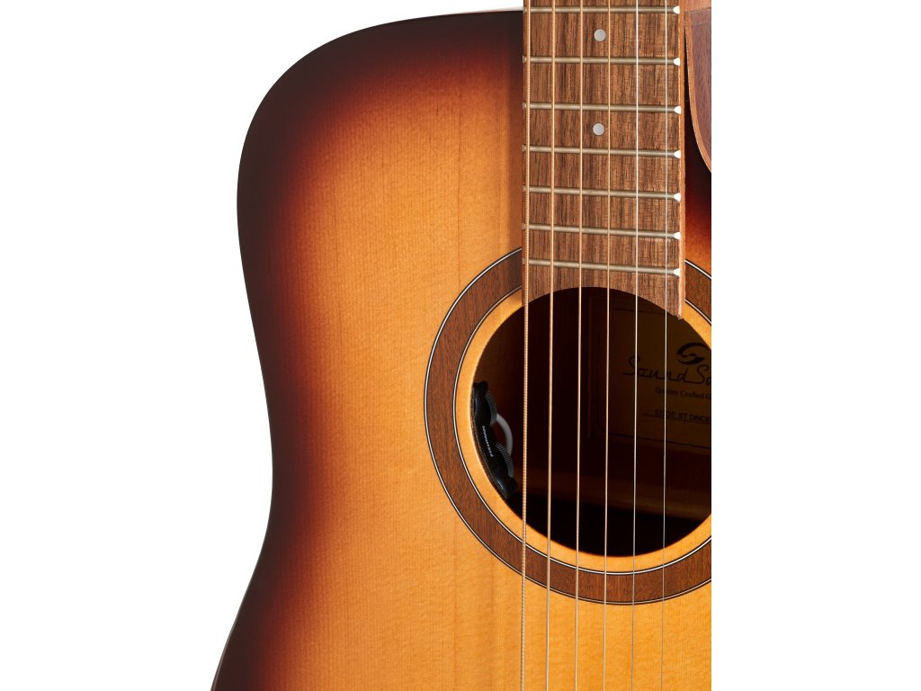 Soundsation EDGE ST DNCE-BSB to przystępna cenowo gitara elektroakustyczna z dużym rezonansowym korpusem typu Dreadnought, odpowiednia nie tylko dla początkujących graczy. Przednia płyta gitary wykonana jest ze sklejki świerkowej, tylna płyta i boki wykonane są ze sklejki sapele. Do gryfu z okoumé o przyjemnym profilu "C" przyklejona jest orzechowa podstrunnica z dwudziestoma progami. Dostęp do wyższych pozycji na podstrunnicy ułatwia dolne wycięcie korpusu.