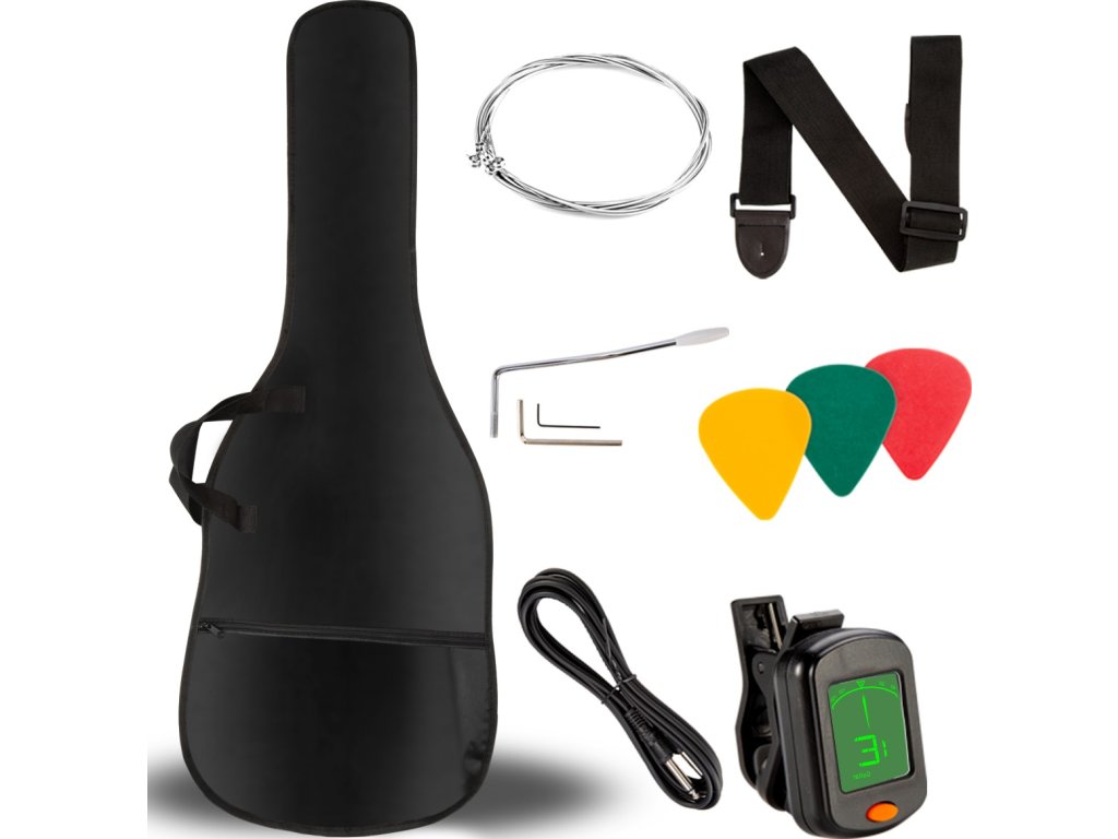 Wraz z gitarą otrzymasz wszelkie niezbędne akcesoria – tuner, kostki, kabel jack-jack 6,35 mm i dźwignię tremolo, co pozwoli Ci zacząć grać od razu po wyjęciu z pudełka. Pokrowiec i pasek umożliwiają wygodne przenoszenie instrumentu do szkoły muzycznej, na próby czy prywatne lekcje. Zapasowe struny i klucze imbusowe gwarantują, że będziesz przygotowany na każdą sytuację – od regulacji mostka po wymianę struny. Wszystko to w jednym zestawie o łącznej wadze zaledwie 6,5 kg – idealna do transportu.