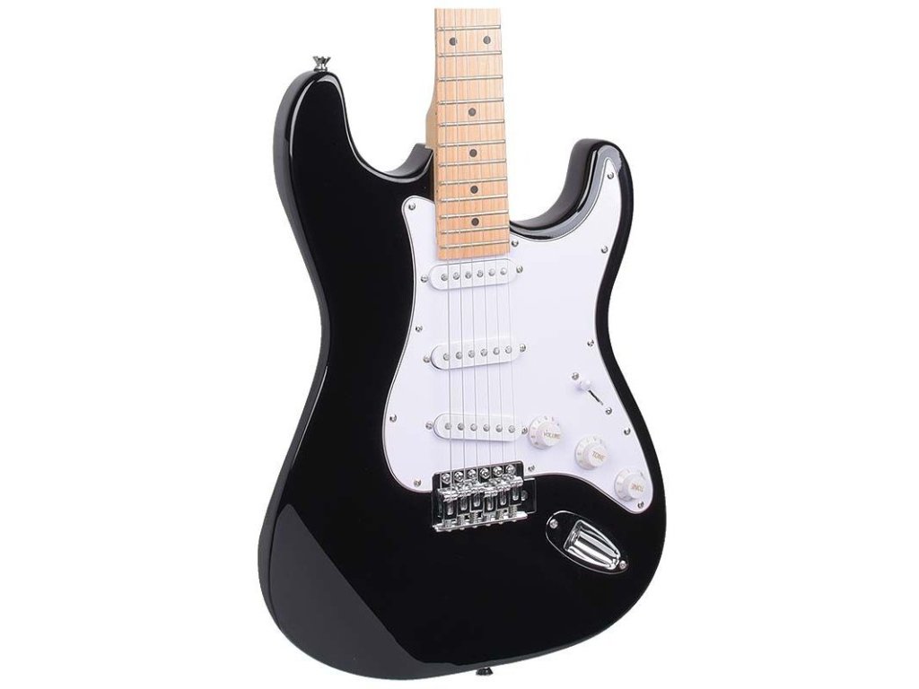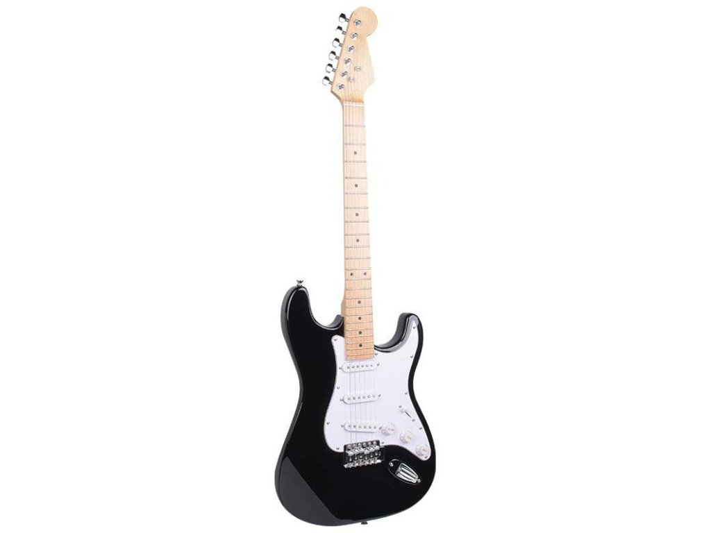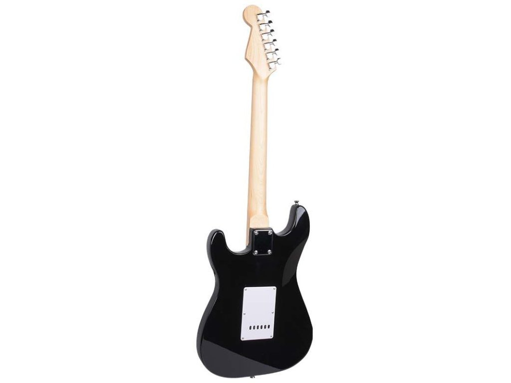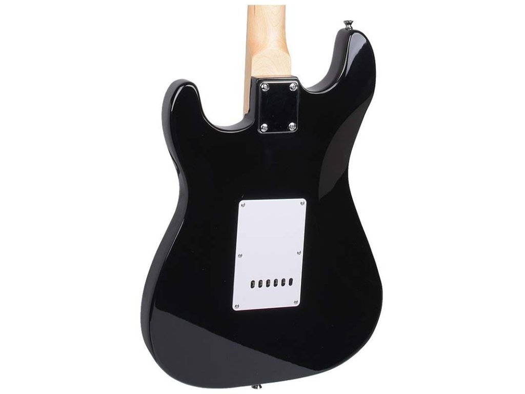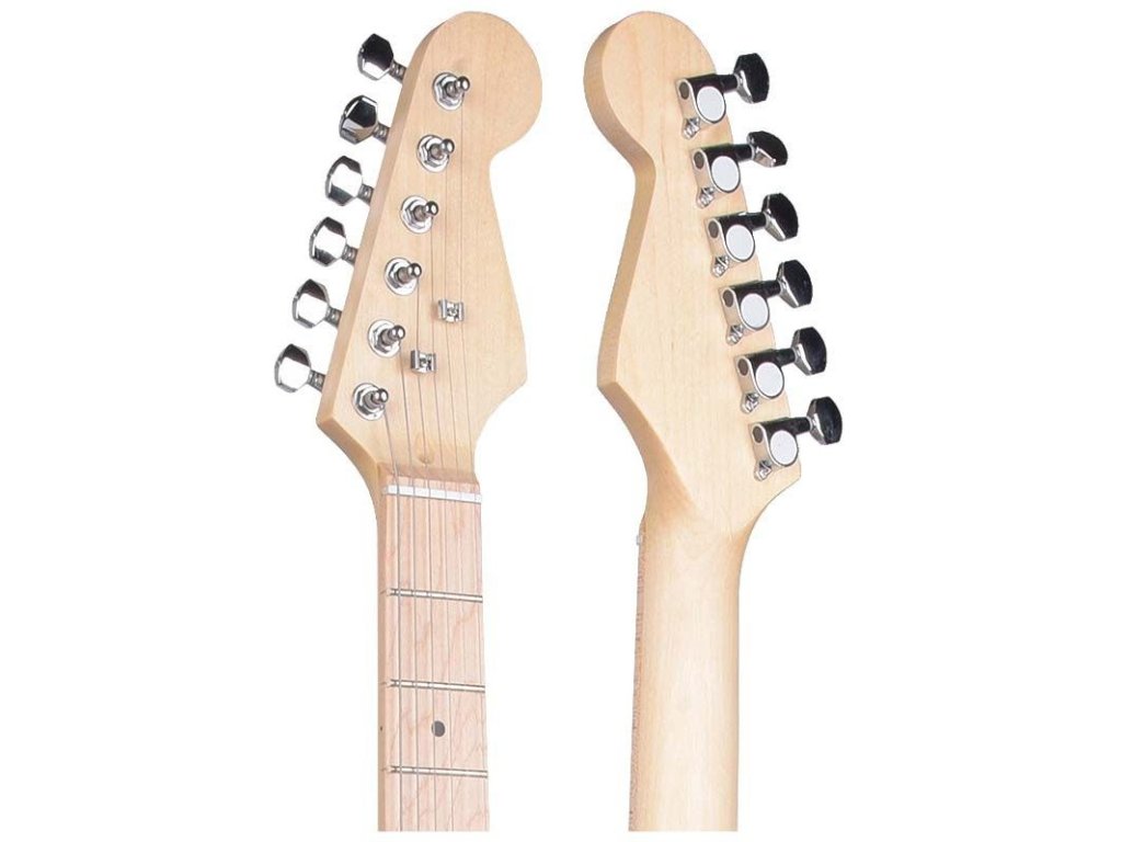 Stratocastery należą do najpopularniejszych gitar elektrycznych na świecie. Od lat 60. XX wieku ich charakterystyczny kształt i konstrukcja zaprojektowane przez firmę Fender prawie się nie zmieniły. Dziś produkuje się wiele kopii tego ikonicznego instrumentu. Prezentowany model jest właśnie jednym z nich. Gitara jest wyposażona w trójcewkowy system przetworników z przełącznikiem i 3 obrotowe potencjometry. Stały mostek ma regulację menzury, dzięki czemu gitarę można precyzyjnie nastroić. Na uwagę zasługuje również samo wykończenie gitary, chromowane detale i połączenie lakierowanego korpusu i białych elementów płyty maskującej, dzięki którym stratocaster wygląda bardzo dobrze.