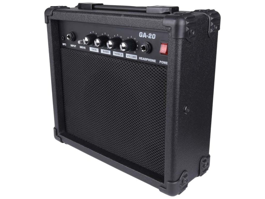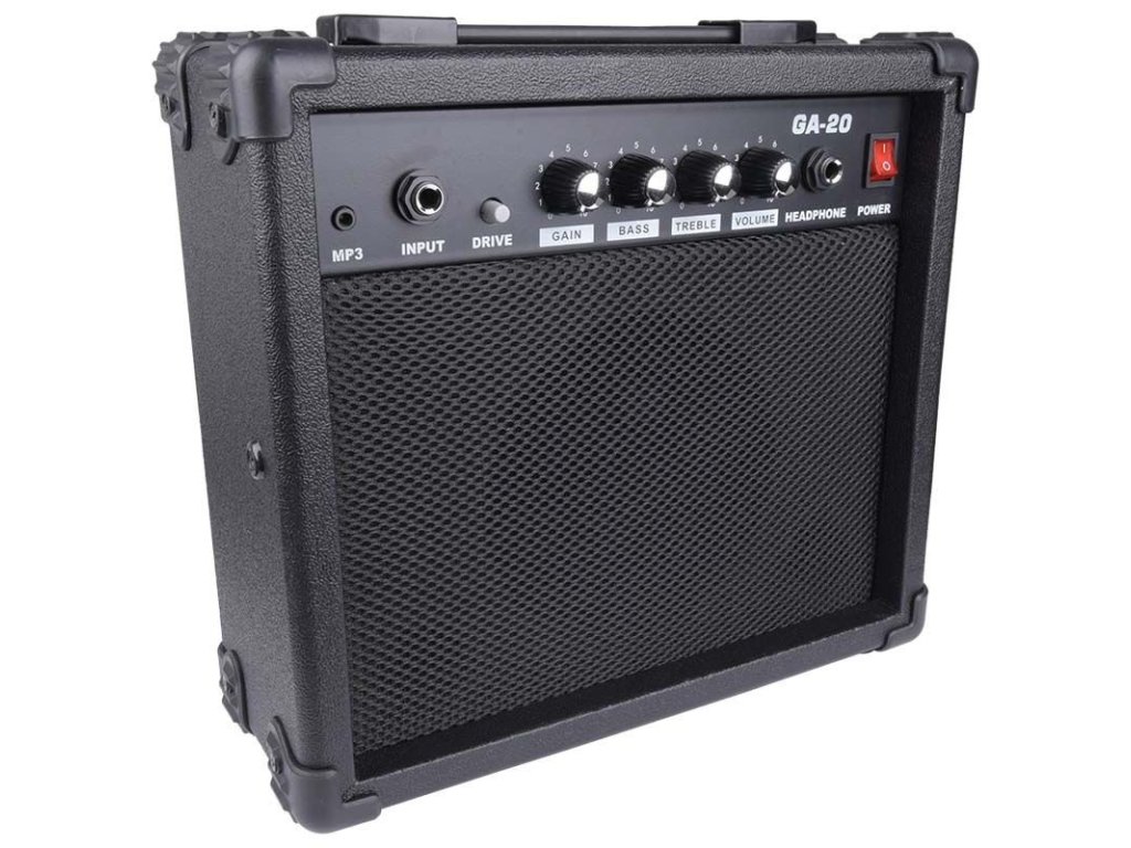 Gitara elektryczna i wzmacniacz to nierozłączne elementy, dlatego w zestawie znajduje się również combo gitarowe. Kombo ma moc 20W. Jest wyposażone w głośnik 5" zamknięty w klasycznej czarnej obudowie. Nad nim znajduje się panel wzmacniacza gitarowego z wejściem jack 6,3 mm do podłączenia gitary i wejściem jack 3,5 mm MP3 do podłączenia zewnętrznych odtwarzaczy. To świetna opcja, dzięki której możemy grać na gitarze z muzyką w tle według własnego wyboru! Cztery obrotowe potencjometry umożliwiają ustawienie parametrów, takich jak głośność, wzmocnienie i korekcja tonów wysokich i niskich. Dodatkowo, za pomocą przełącznika Drive można przesterować sygnał gitarowy, uzyskując specyficzne brzmienie charakterystyczne dla takich gatunków muzycznych, jak blues, rock lub metal.