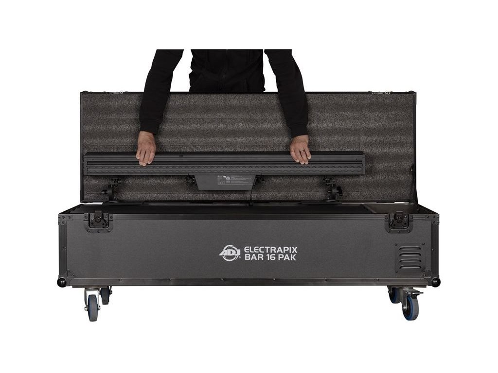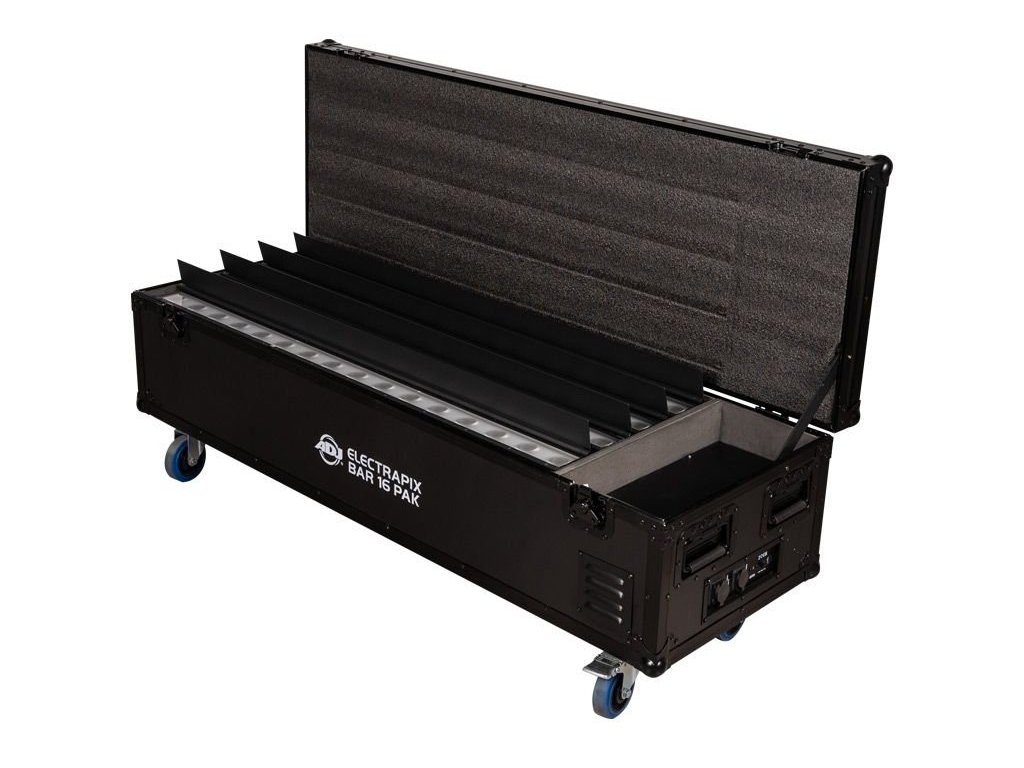5. ElectraPix Bar 16 FC (walizka transportowa) (x1): Chroń swoją inwestycję i łatwo transportuj swój sprzęt za pomocą walizki transportowej ElectraPix Bar 16 FC. Ta solidna i dobrze zaprojektowana obudowa zapewnia bezpieczne i zorganizowane rozwiązanie do przechowywania świateł, stacji ładujących, pilota zdalnego sterowania i kabla zasilającego. Wymiary walizki (dł. x szer. x wys.): 1443x498,4x459,9 mm zapewniają, że Twój zestaw oświetleniowy pozostanie chroniony podczas transportu.