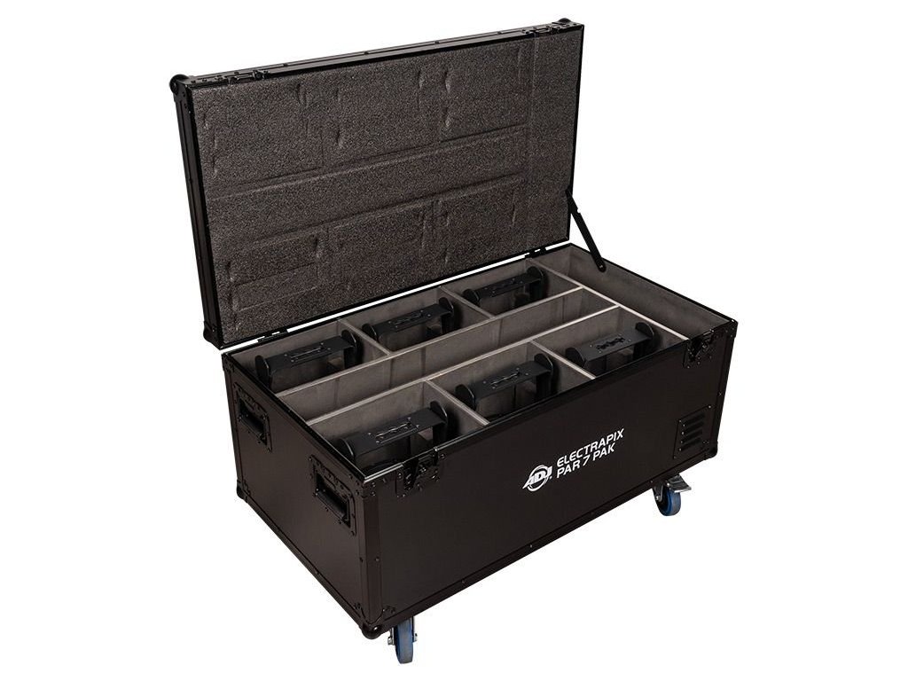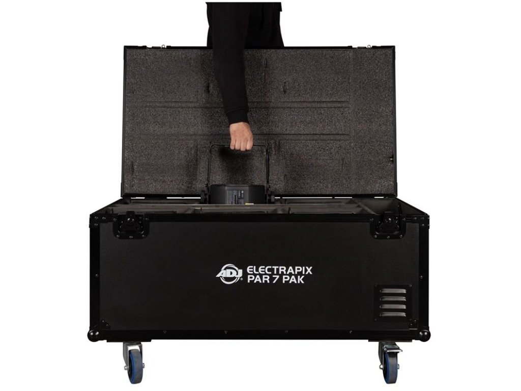 5. ElectraPix Par 7 FC (futerał transportowy) (x1): Dzięki futerałowi transportowemu ElectraPix Par 7 FC ochronisz swoją inwestycję i z łatwością przetransportujesz swój sprzęt. Ta solidna i dobrze zaprojektowana obudowa zapewnia bezpieczne i zorganizowane rozwiązanie do przechowywania świateł, stacji ładujących, pilota zdalnego sterowania i kabla zasilającego. Wymiary walizki transportowej (dł. x szer. x wys.): 577x1026x567 mm zapewniają, że Twój zestaw oświetleniowy pozostanie chroniony podczas transportu.