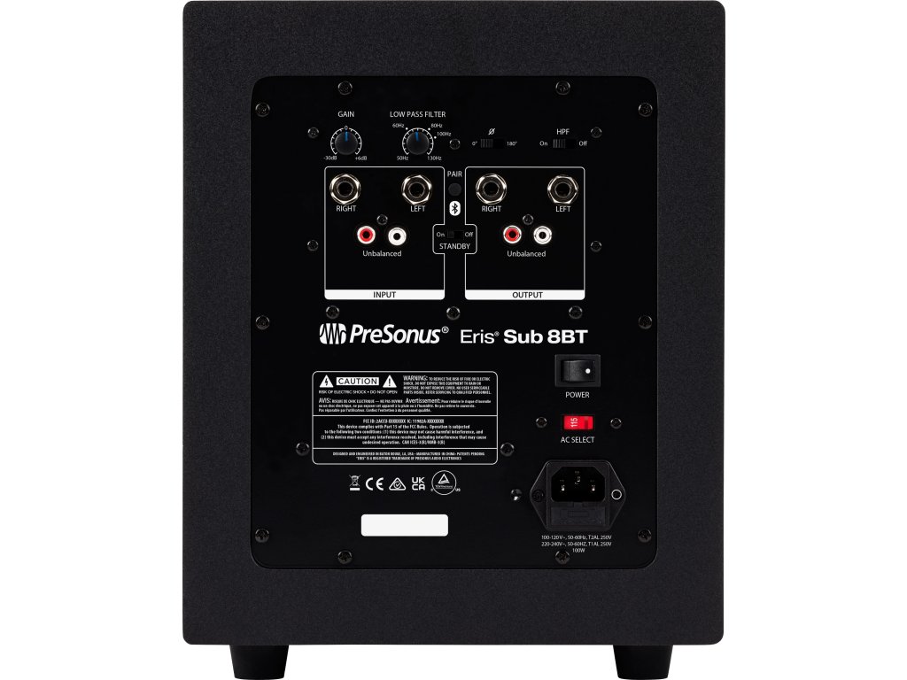 Jako pierwszy subwoofer studyjny PreSonus oferuje bezprzewodowe połączenie Bluetooth 5.0. Eris Sub 8BT oferuje również elastyczne opcje połączeń przewodowych, dzięki czemu można go łatwo dodać do niemal każdego systemu monitoringu. Wbudowane elementy sterujące umożliwiają łatwe stworzenie systemu monitoringu 2.1 i dostrojenie go do akustyki pomieszczenia. Elementy sterujące filtrami górnoprzepustowym i dolnoprzepustowym (crossover) zapewniają, że Eris Sub 8BT zacznie działać dokładnie na częstotliwości, na której kończą się główne monitory, co pozwala uniknąć ospałego, rozmytnego bałaganu w niskich częstotliwościach, który powstaje bez crossovera.