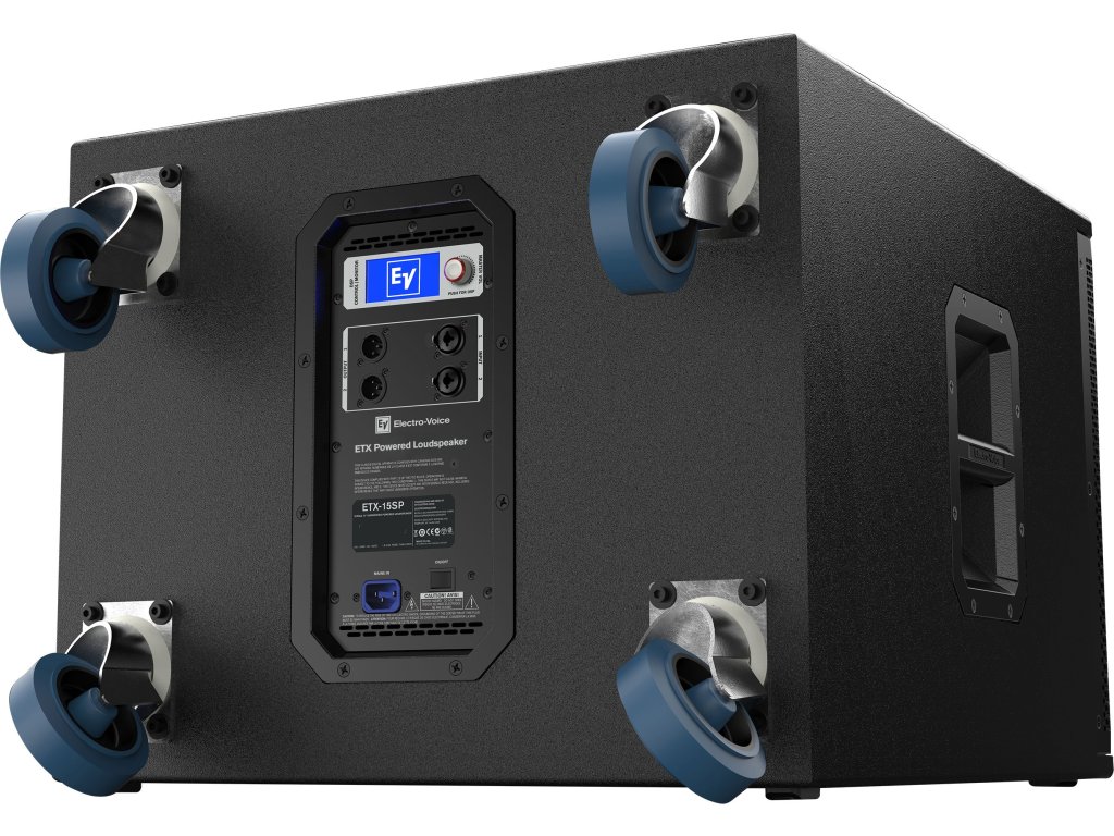 Profesjonalny aktywny subwoofer, wzmacniacz klasy "D", 15" głośnik niskotonowy, dwa wejścia i dwa wyjścia (możliwość pracy z dwoma satelitami), złącza kombo Neutrik, procesor DSP z wyświetlaczem (ustawienia crossovera, EQ, limitera, praca dwóch ETX-15SP w trybie "kardio"), zakres częstotliwości 32Hz - 180kHz, max. SPL 134dB, moc RMS 900W, materiał 18mm - 13-warstwowa sklejka brzozowa ze specjalnym lakierem (EV coat), gniazdo na sztycę dystansową (wsuwane i wkręcane), odłączane kółka.