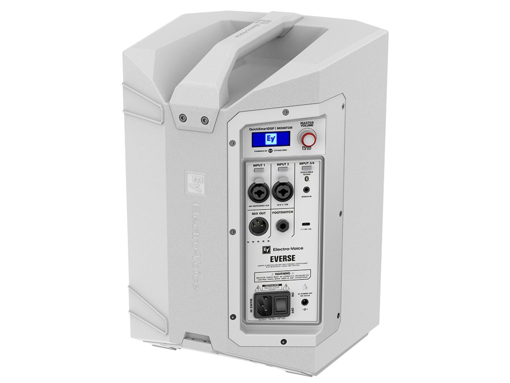 Electro-Voice EVERSE 8 to zasilany bateryjnie głośnik, który łączy przenośne i profesjonalne kolumny głośnikowe w rosnącym segmencie systemów PA zasilanych bateryjnie, a jednocześnie jest lżejszy niż jakikolwiek inny reprobox o porównywalnej wielkości. EVERSE 8 z obudową IP43 jest przygotowany do wytrzymania kaprysów pogody. Oferuje bezprzewodowe sterowanie i odtwarzanie audio przez Bluetooth, opóźnienie do 100 m, wbudowany mikser z efektami, poziom ciśnienia akustycznego (maxSPL) 121 dB, pokrycie pod kątem 100º x 100º, wzmacniacz klasy D i zasilanie fantomowe 48V. EVERSE 8 jest zasilany bateriami Li-ion.