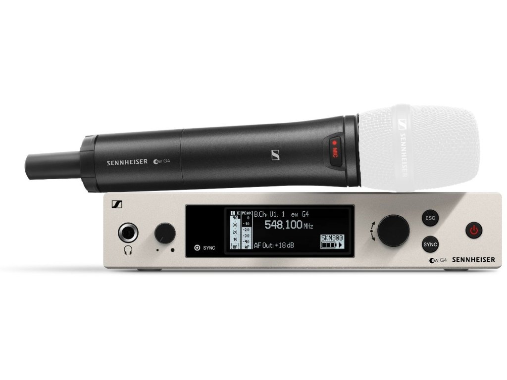 ew 300 G4-SKM (BASE) to bezprzewodowy zestaw z nadajnikiem ręcznym bez głowicy mikrofonowej. Nadajnik ręczny SKM 300 G4-S z przyciskiem MUTE i stykami ładowania można połączyć z dowolną głowicą mikrofonową. Podobnie jak odbiornik rackowy EM 300 G4, jest wyposażony w dwadzieścia jeden grup częstotliwości z dwudziestoma czterema bezpośrednio dostępnymi ustawieniami wstępnymi do natychmiastowego użycia.