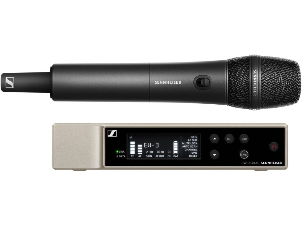 EW-D 835-S to bezprzewodowy, cyfrowy zestaw mikrofonowy składający się z odbiornika rackowego i ręcznego, bezprzewodowego mikrofonu dynamicznego do śpiewu i mowy, a sposób jego wykorzystania zależy wyłącznie od Ciebie. Nadajnik ręczny z wymienną główką mikrofonową jest wyposażony w przełącznik MUTE umożliwiający krótkotrwałe wyłączenie mikrofonu. Na nadajniku, poza włącznikiem, nie ma żadnych innych elementów sterujących, wszystkie parametry ustawiane są na odbiorniku lub z telefonu komórkowego bądź tabletu w aplikacji Smart Assist.