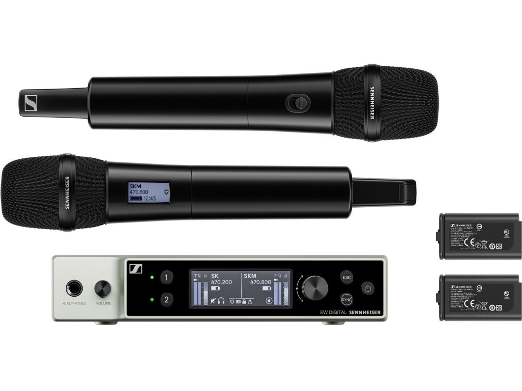 Sennheiser EW-DX 835-S Set to dwukanałowy, bezprzewodowy, cyfrowy zestaw mikrofonowy składający się z odbiornika rackowego i 2 dynamicznych mikrofonów ręcznych do śpiewu i mowy, zależy tylko od Ciebie, jak je wykorzystasz. Nadajnik ręczny z wymienną główką mikrofonową jest wyposażony w przełącznik MUTE umożliwiający krótkotrwałe wyłączenie mikrofonu. Na nadajniku z wyświetlaczem e-ink można ustawić częstotliwość filtra basowego (high-pass) i podstawowe ustawienie czułości (trim), wszystkie pozostałe parametry ustawia się na odbiorniku lub z telefonu komórkowego lub tabletu w aplikacji Smart Assist.