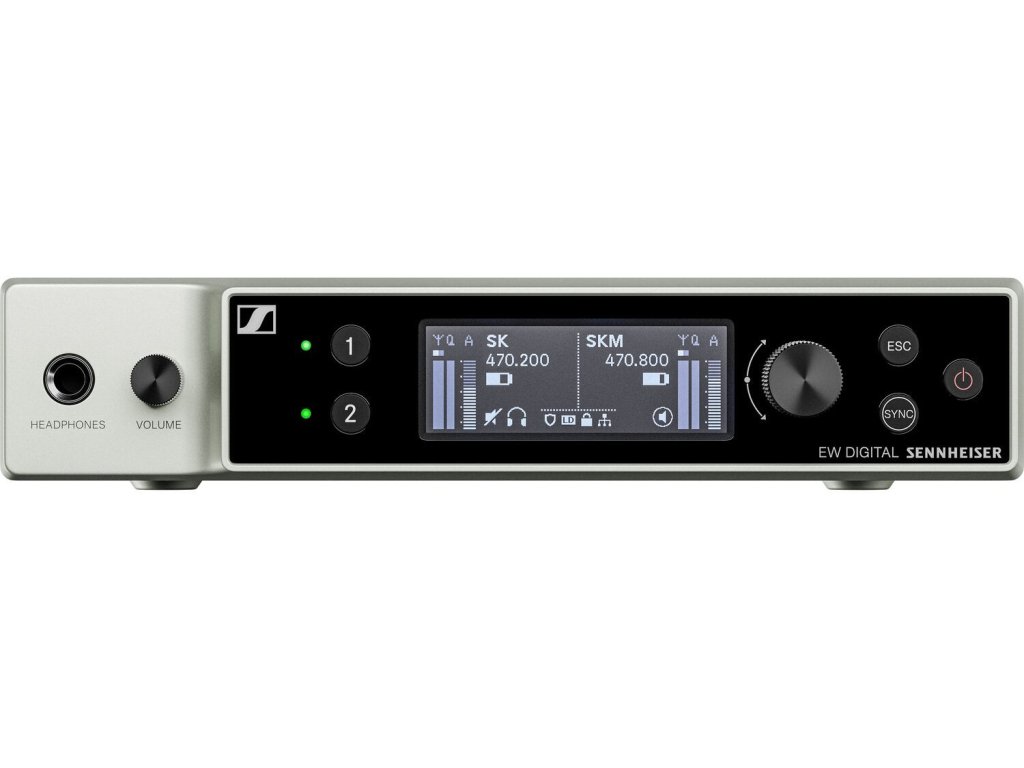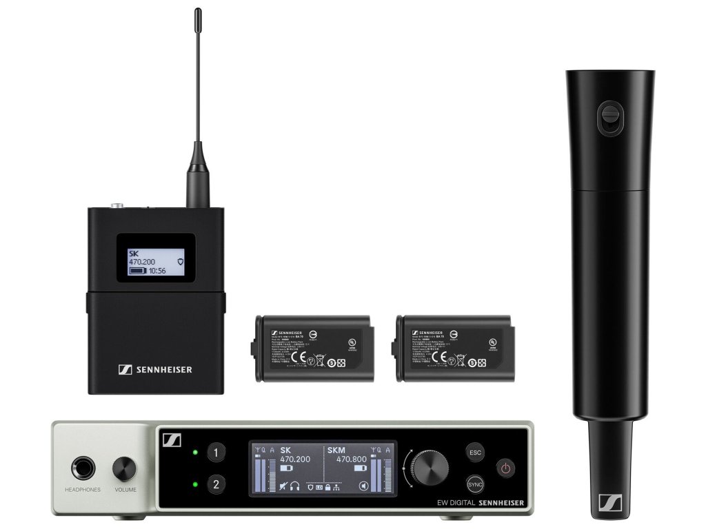 Sennheiser EW-DX SK / SKM-S Base Set to uniwersalny podwójny cyfrowy system bezprzewodowy z nadajnikiem typu bodypack i nadajnikiem ręcznym. Dostarczany bez mikrofonów. Nadajnik ręczny kompatybilny z główkami mikrofonowymi MMD, MME, MMK, KK i MM jest wyposażony w przełącznik MUTE umożliwiający krótkotrwałe wyłączenie mikrofonu. Nadajnik typu bodypack umożliwia użycie wszystkich mikrofonów krawatowych i nagłownych ze złączem jack 3,5 EW. Na nadajniku z wyświetlaczem e-ink można ustawić częstotliwość filtra basowego (high-pass) i podstawowe ustawienia czułości (trim), wszystkie pozostałe parametry ustawia się na odbiorniku lub z telefonu komórkowego bądź tabletu w aplikacji Smart Assist.