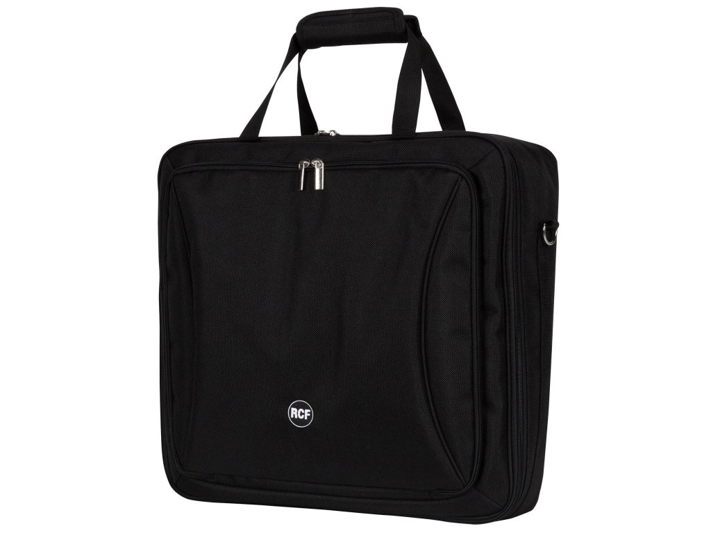 Wyściełana torba na miksery RCF F 12XR z uchwytem i paskiem na ramię. Szeroka przednia kieszeń z dzieloną sekcją na tablety i inne akcesoria.